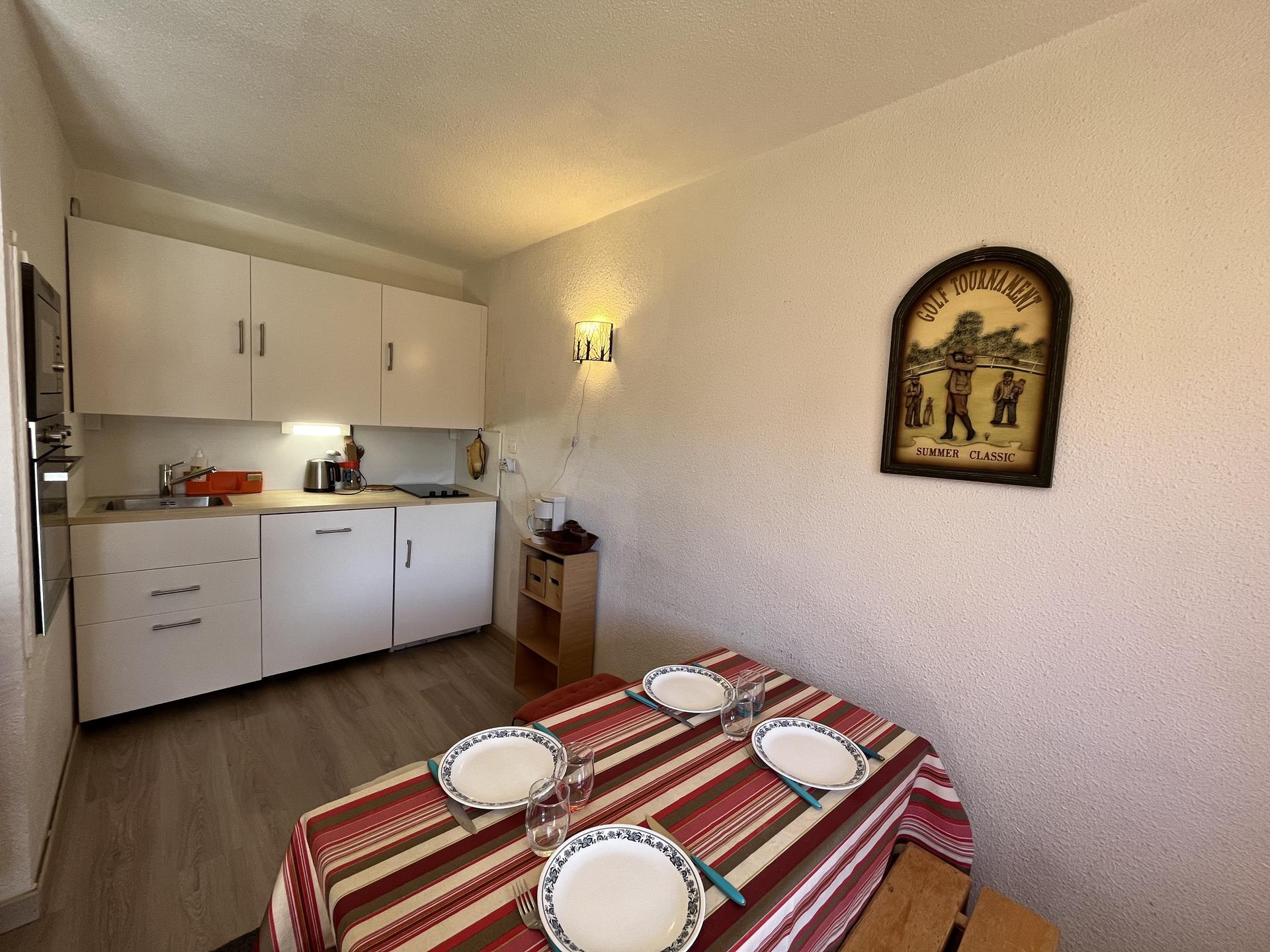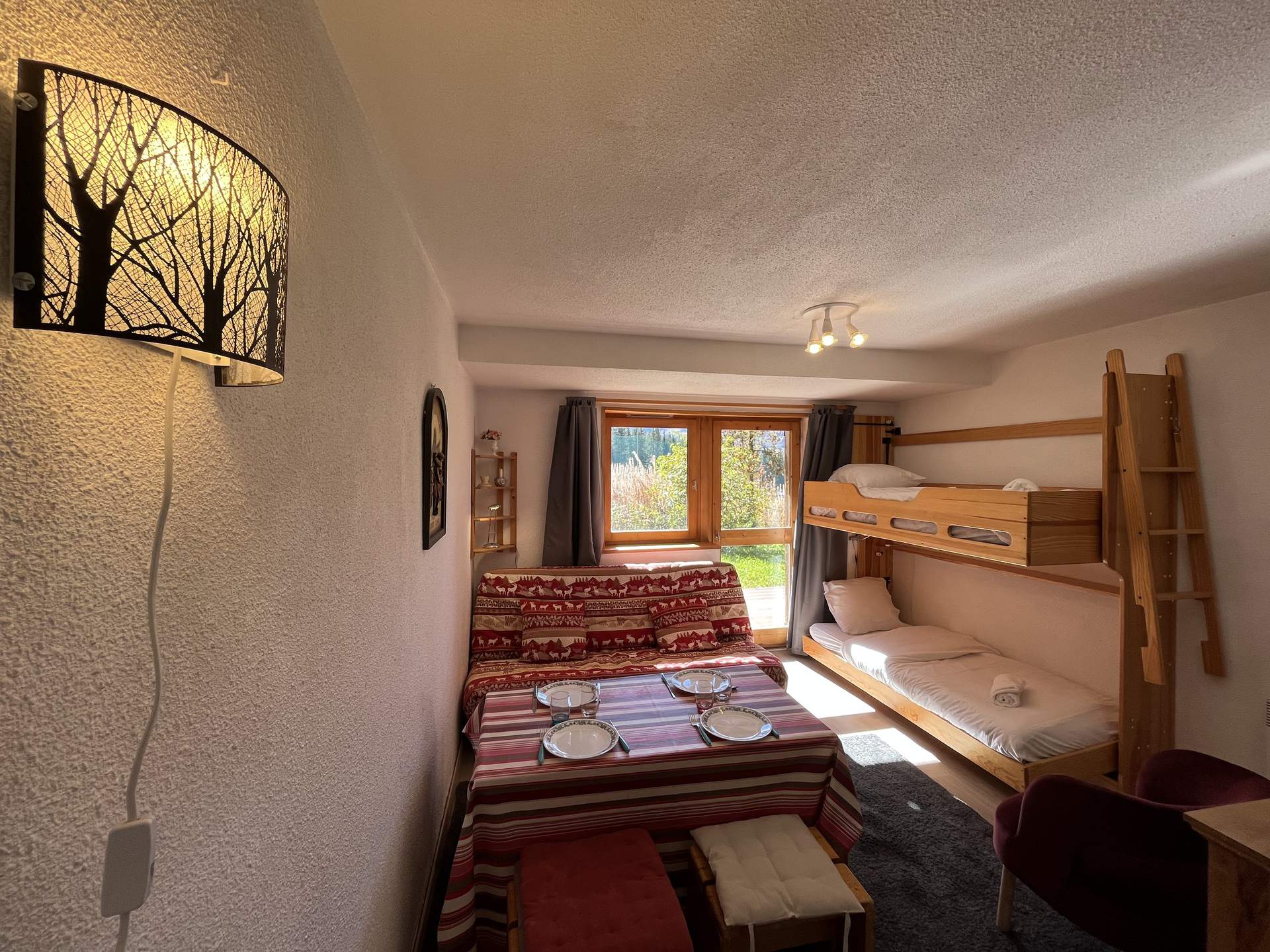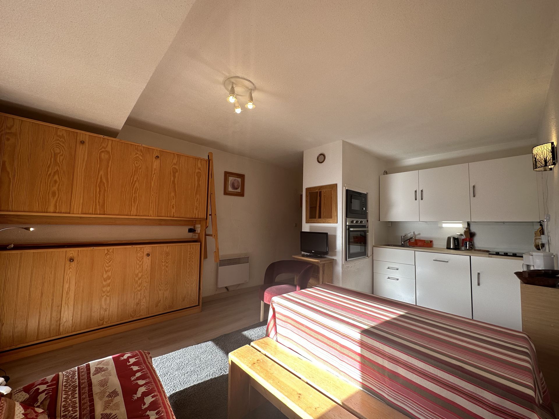 Discover this 20 m² apartment, located on the ground floor of the residence, with a terrace overlooking the slopes. Your comfort includes: Living area: sofa bed for two (140x190) and two foldable single beds (90x190) (top bed not suitable for children under 6), equipped with a TV Open kitchen: 2 cer...