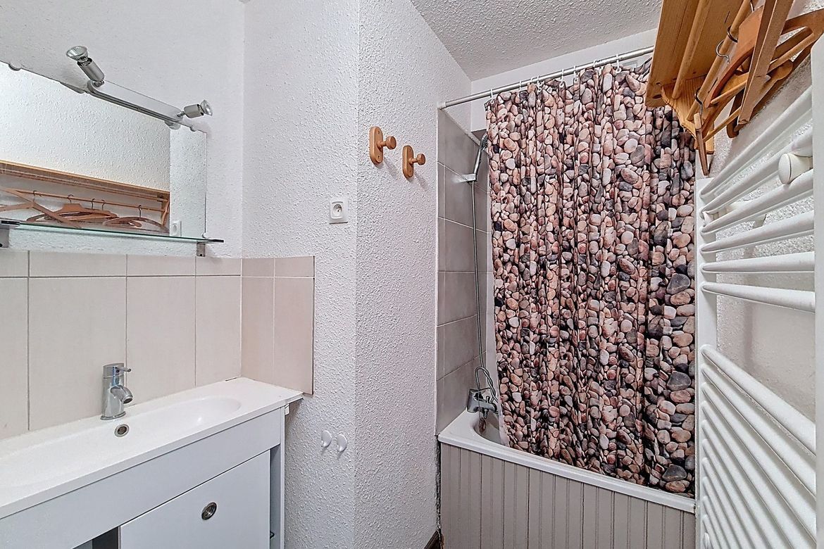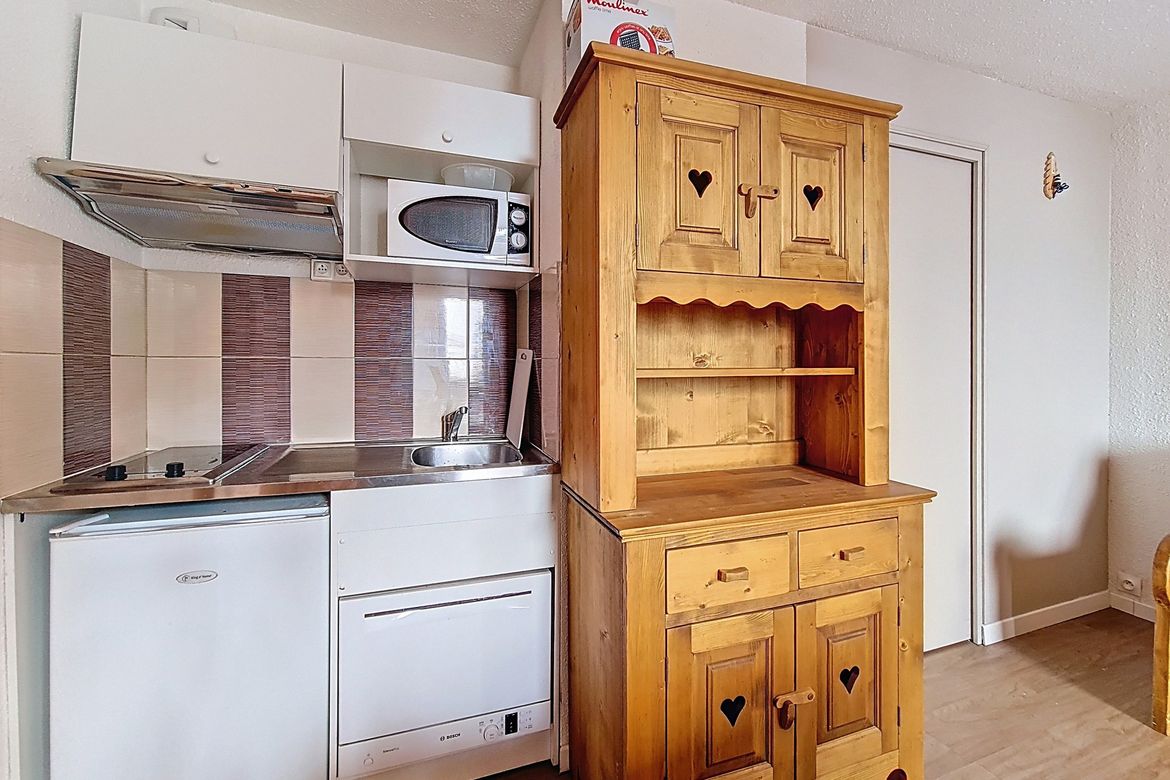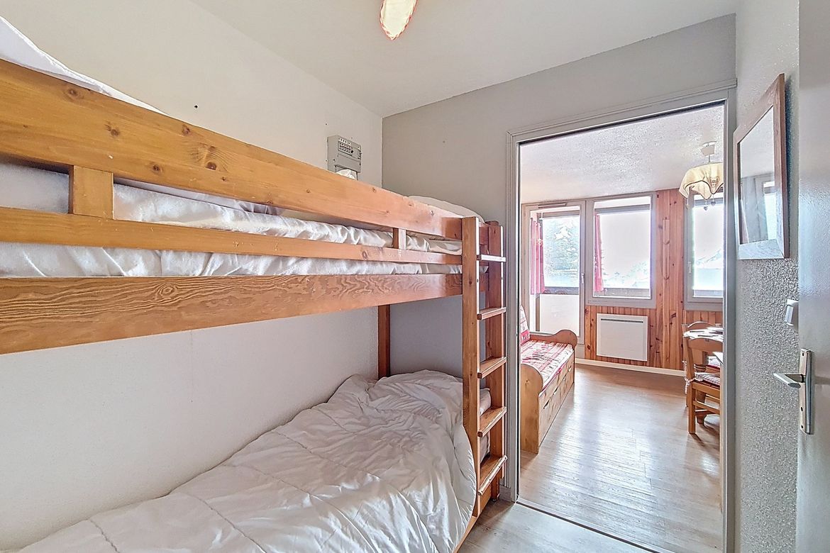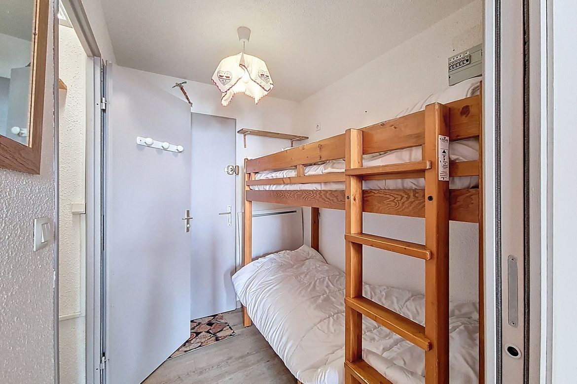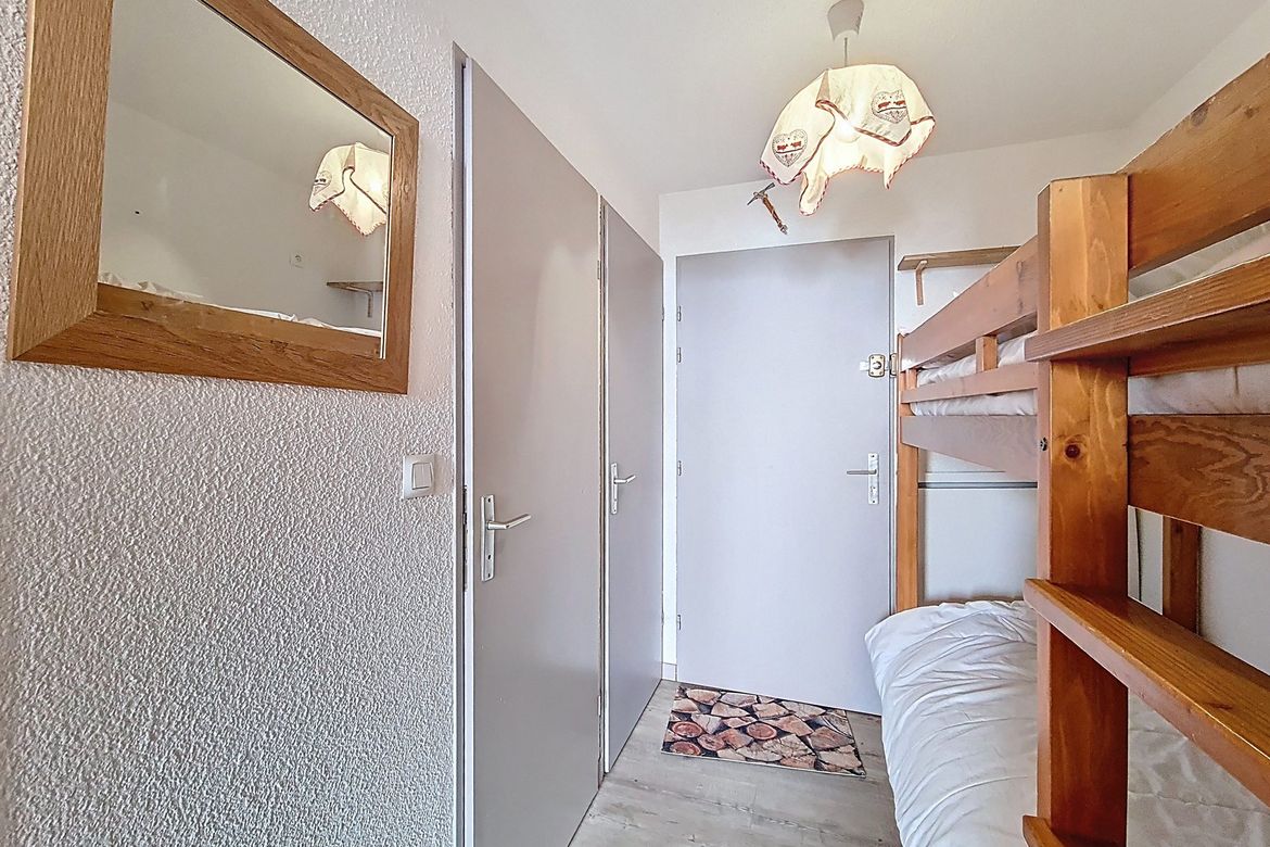 22m² studio apartment for 4 people. It is located on the 3rd floor of the residence and has an enclosed south-facing balcony. LABEL: 2 Flocons Argent Living room: 1 single sofa bed + 1 pull-out trundle bed. Equipped with television Entrance hall (separated from the living room by a sliding door): ...