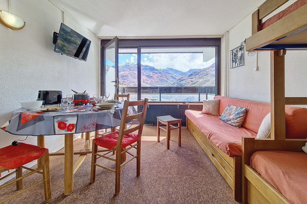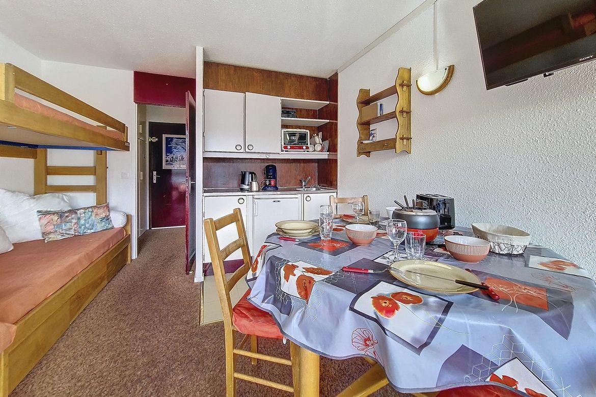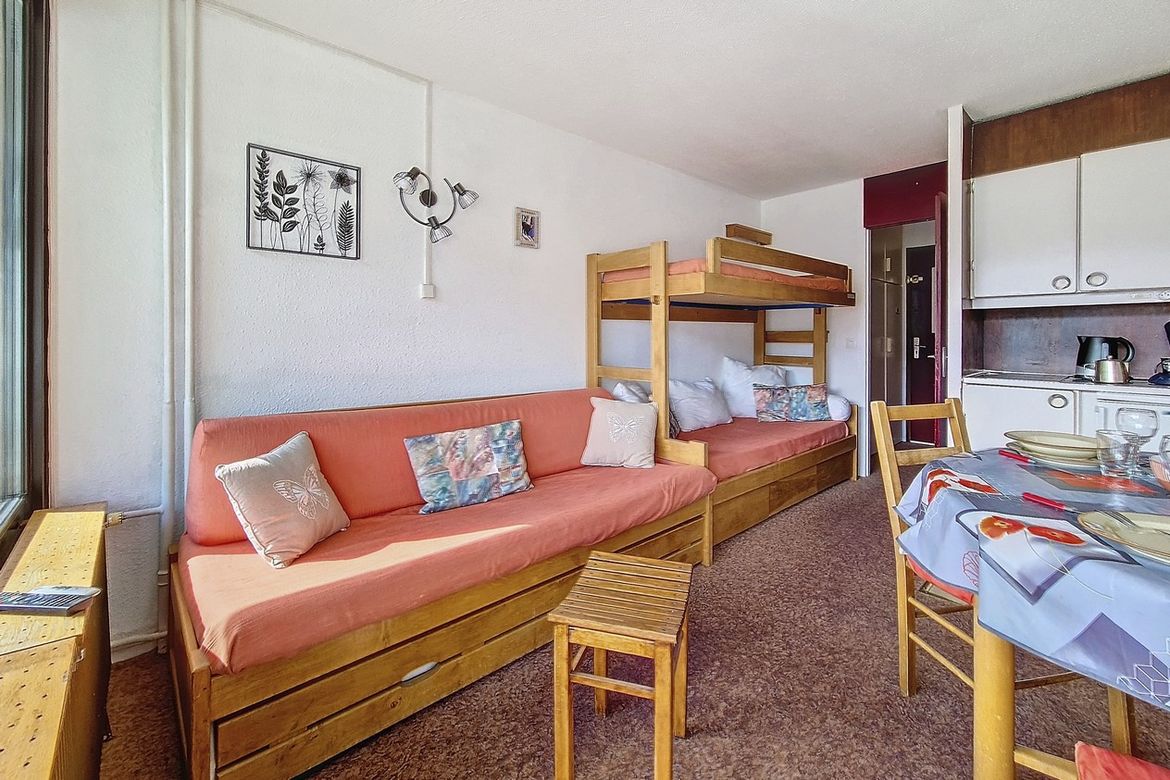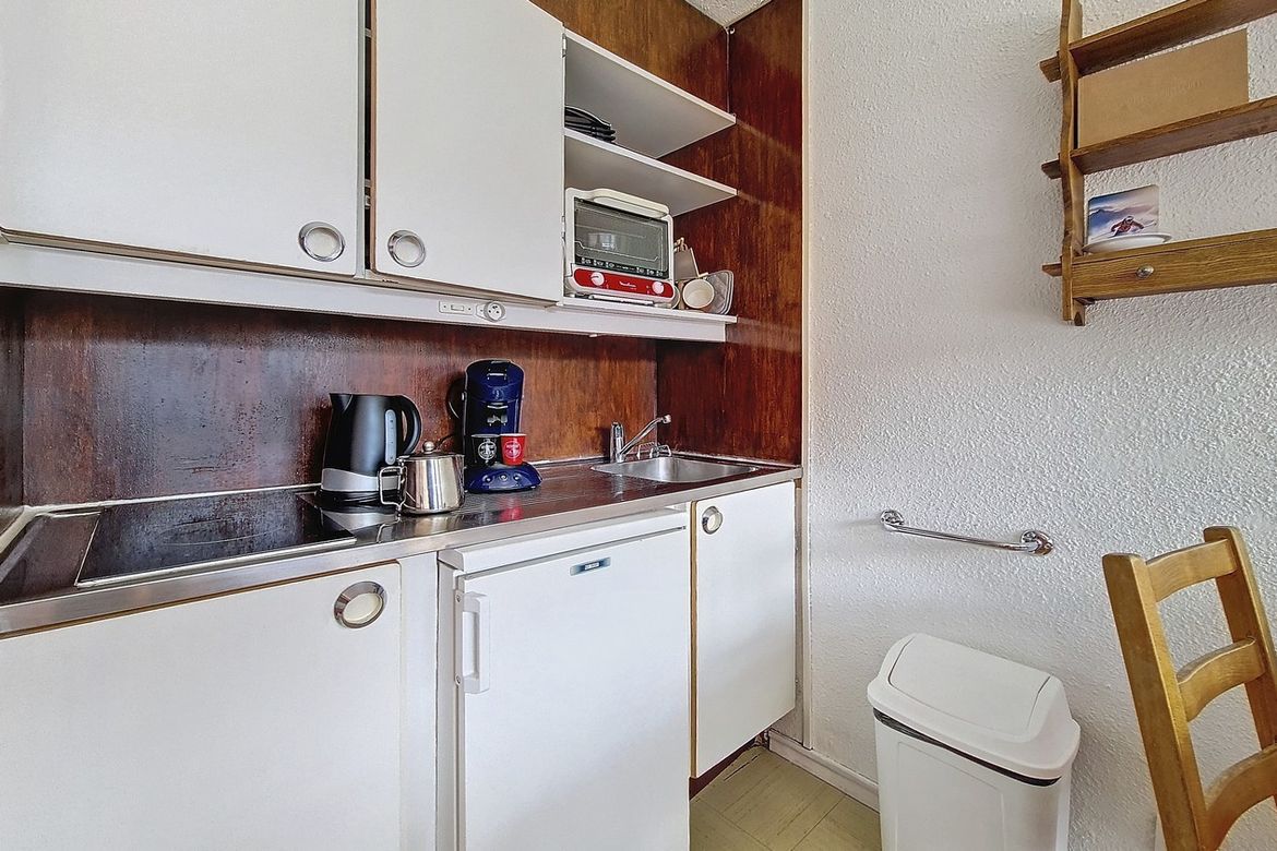 19 m² studio for 3 people. It is located on the 7th floor with lift and has a south-facing balcony (slopes view). Living room: 1 folding bed for 2 persons + 2 bunk beds. TV. Bathroom with claw-foot bath and WC Fitted kitchen with 2 ceramic hobs, fridge, kettle, toaster and coffee maker. Flat ...