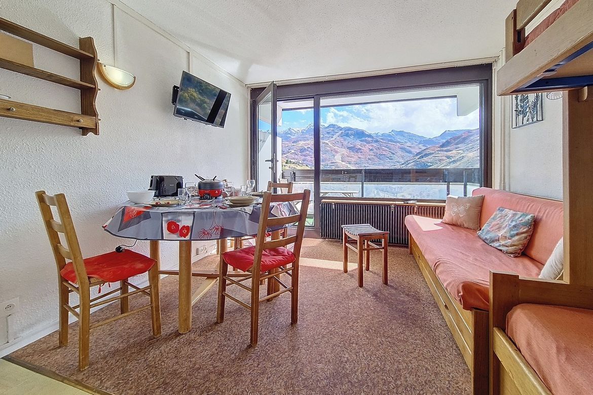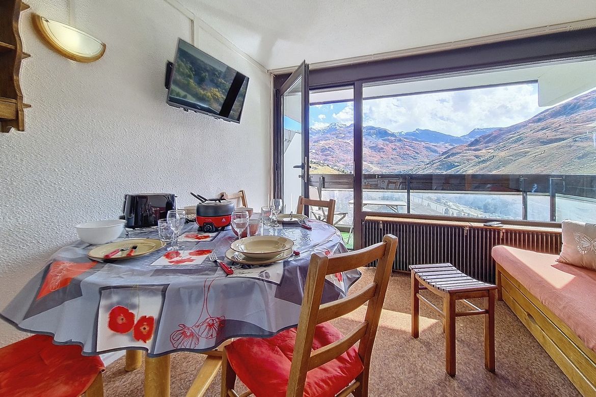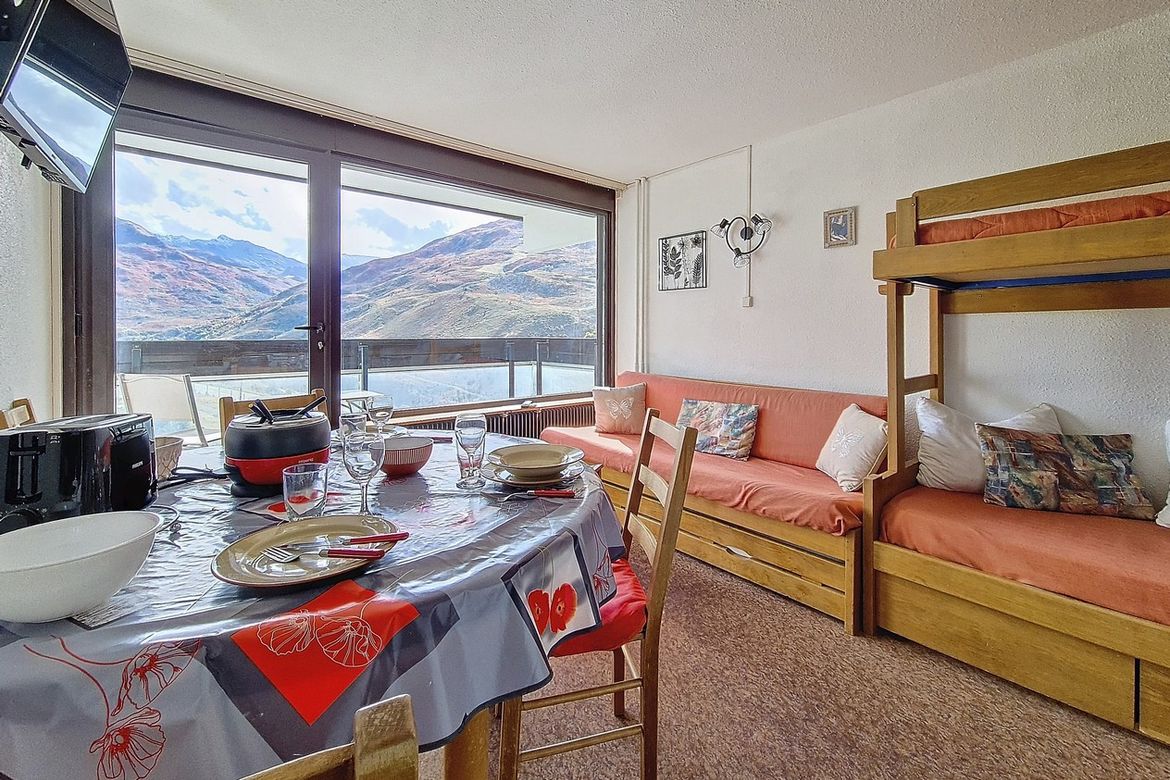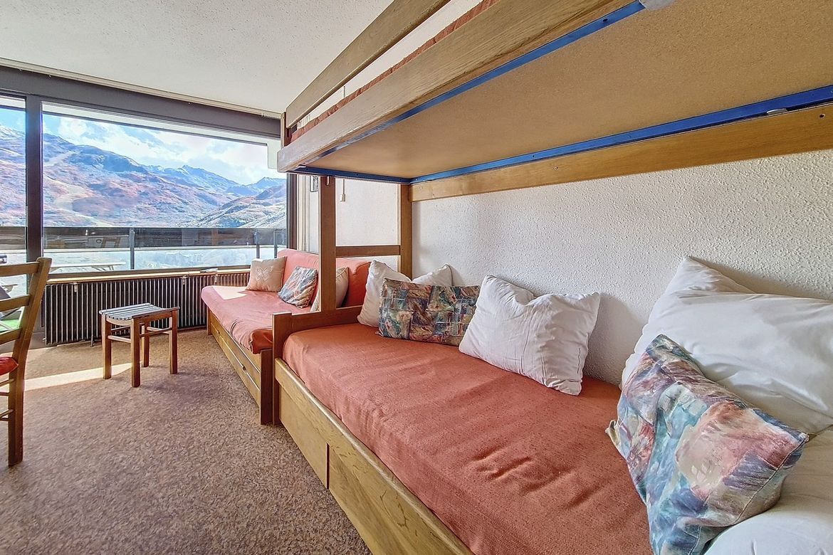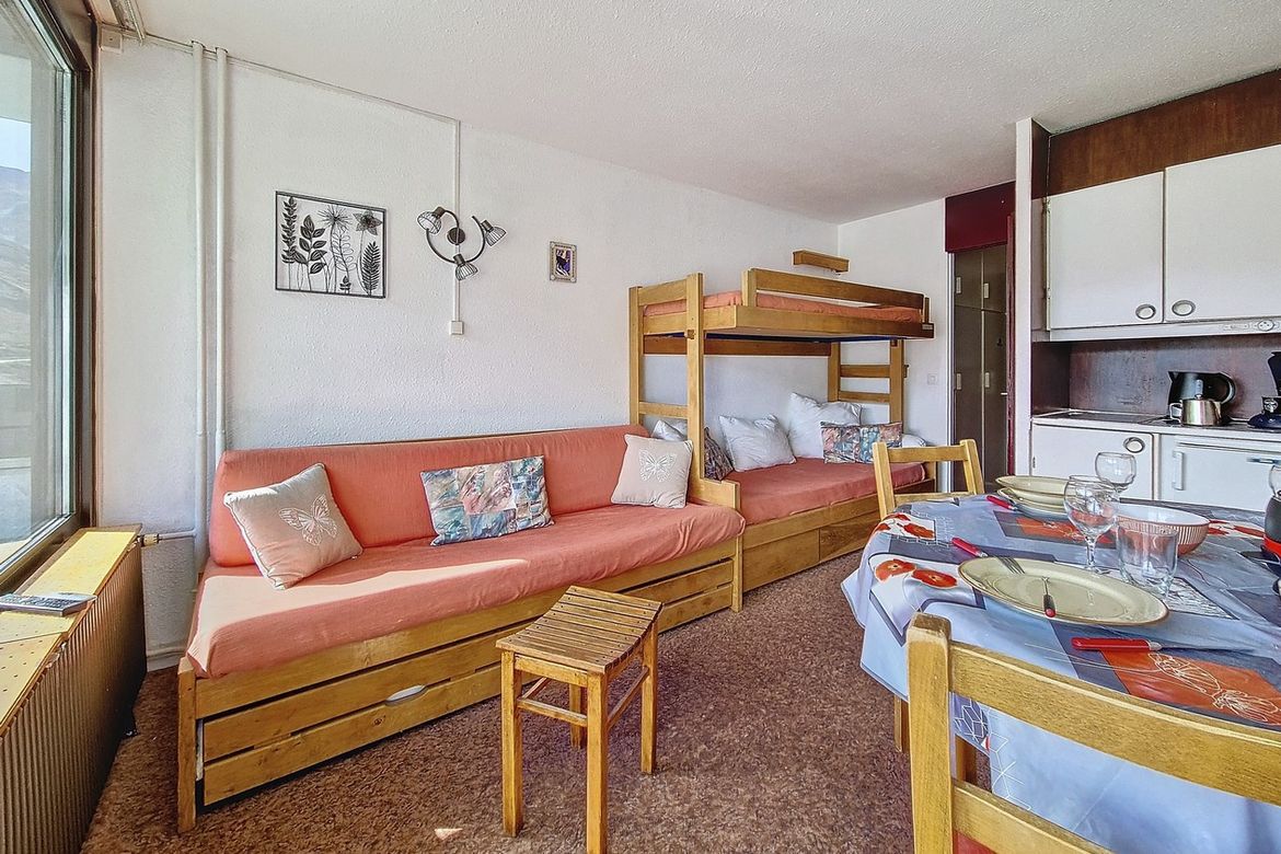 19 m² studio for 3 people. It is located on the 7th floor with lift and has a south-facing balcony (slopes view). Living room: 1 folding bed for 2 persons + 2 bunk beds. TV. Bathroom with claw-foot bath and WC Fitted kitchen with 2 ceramic hobs, fridge, kettle, toaster and coffee maker. Flat ...