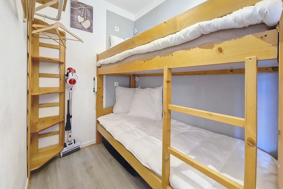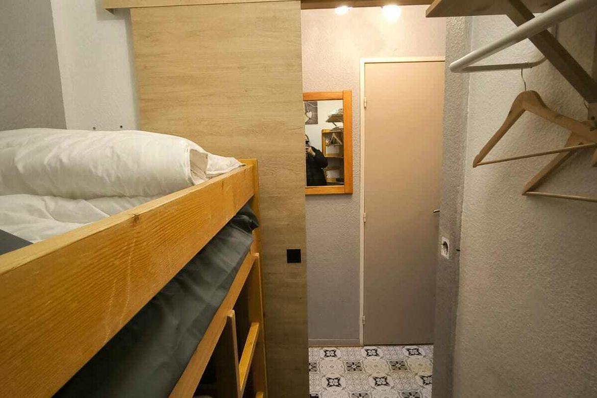 18m² studio apartment with cabin located on the 7th floor with lift. It has a west-facing balcony. Label : Living room: a 2 person rapido sofa bed. Cabin: 1 single bed. Built-in kitchen with 2 induction hobs, fridge, microwave and dishwasher, toaster, kettle and coffee maker. Bathroom with sh...