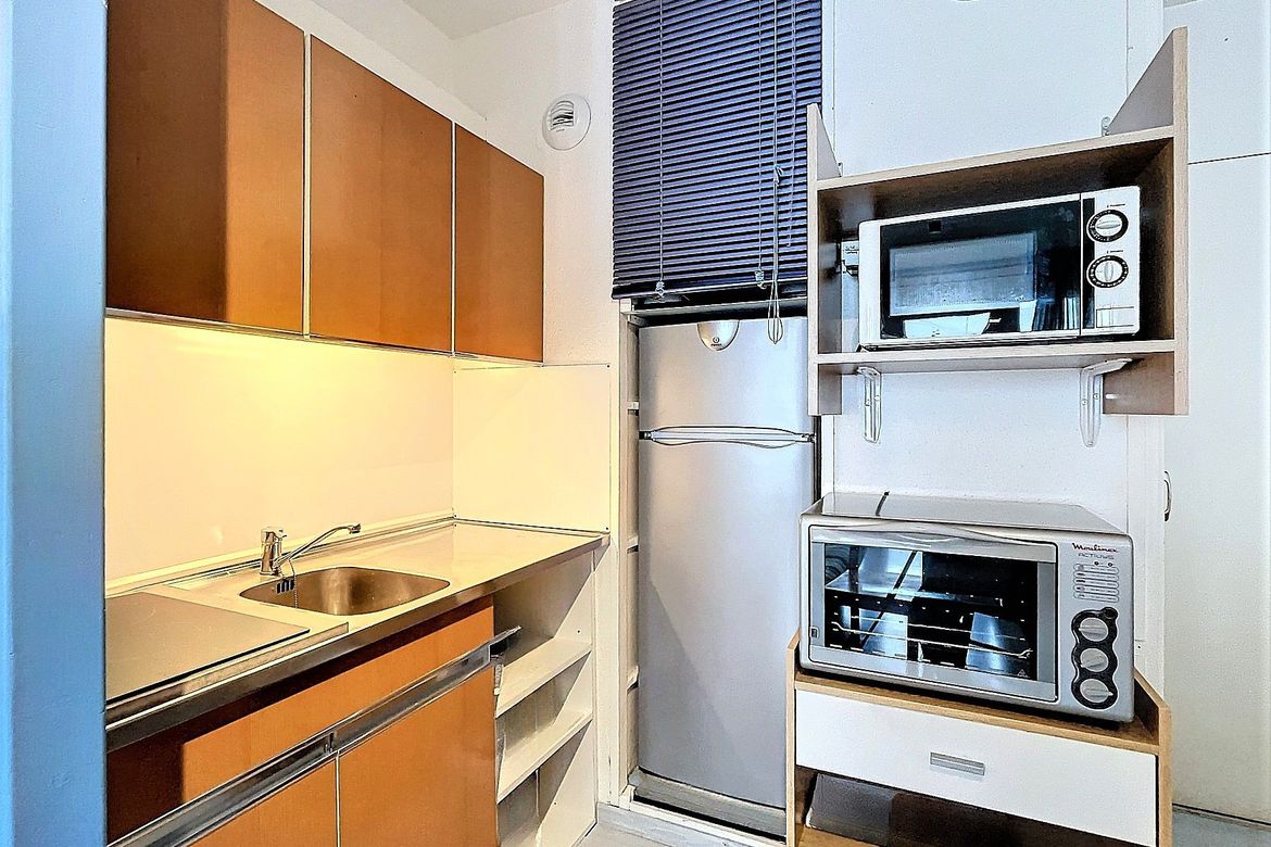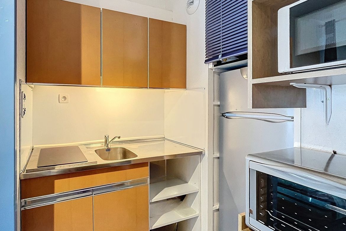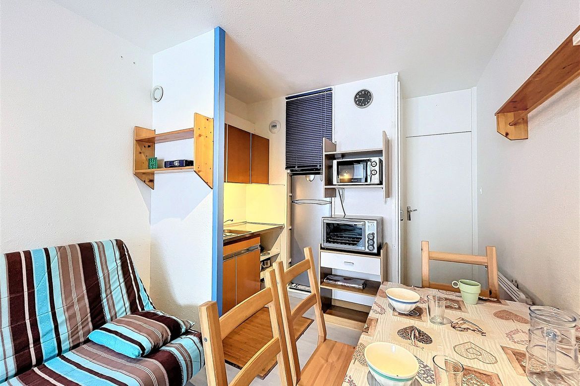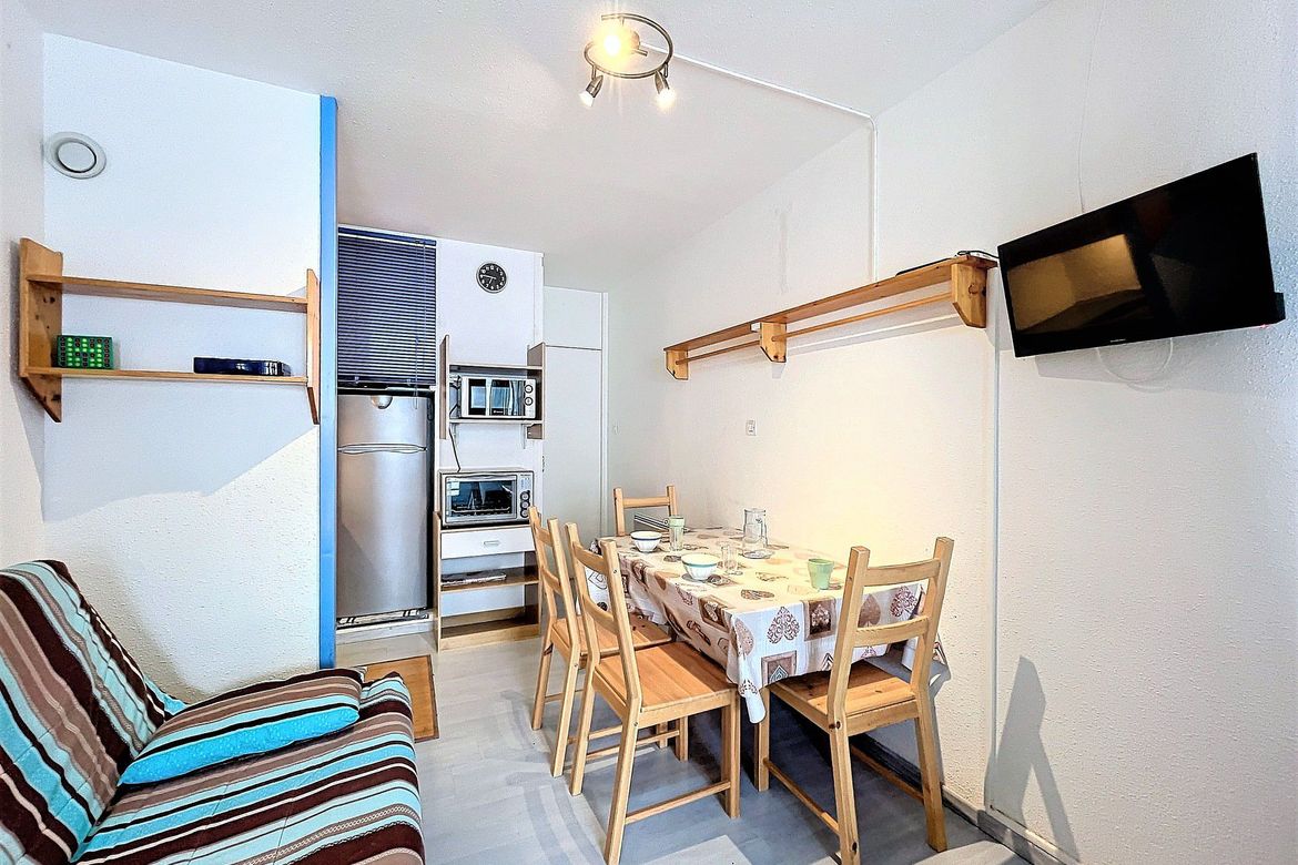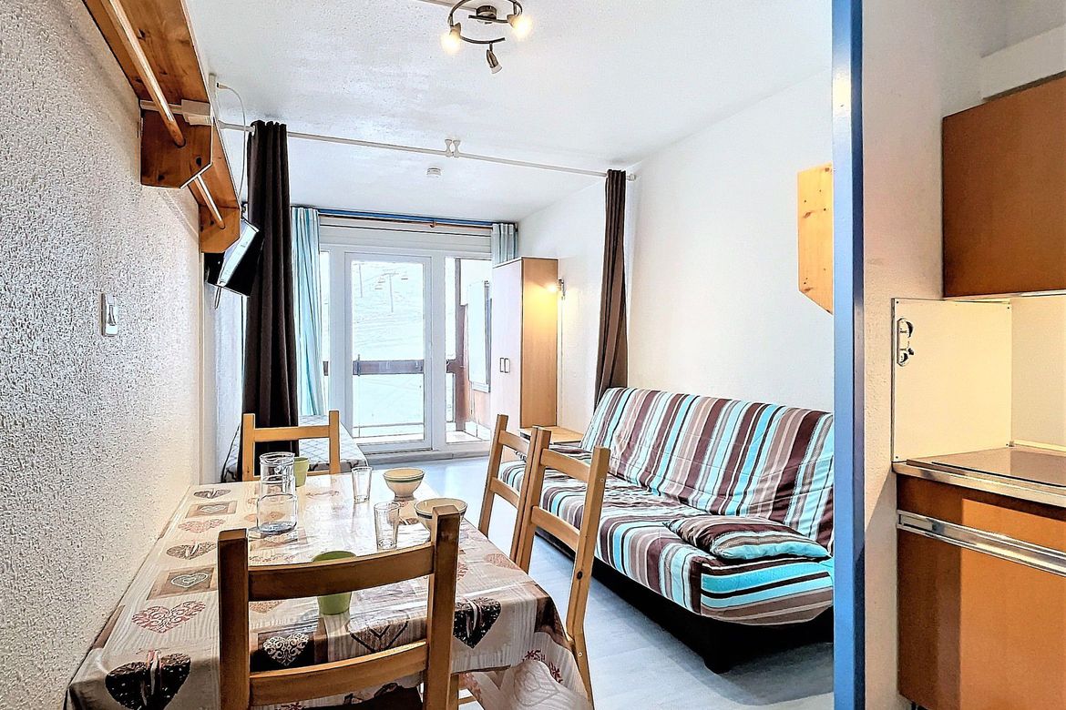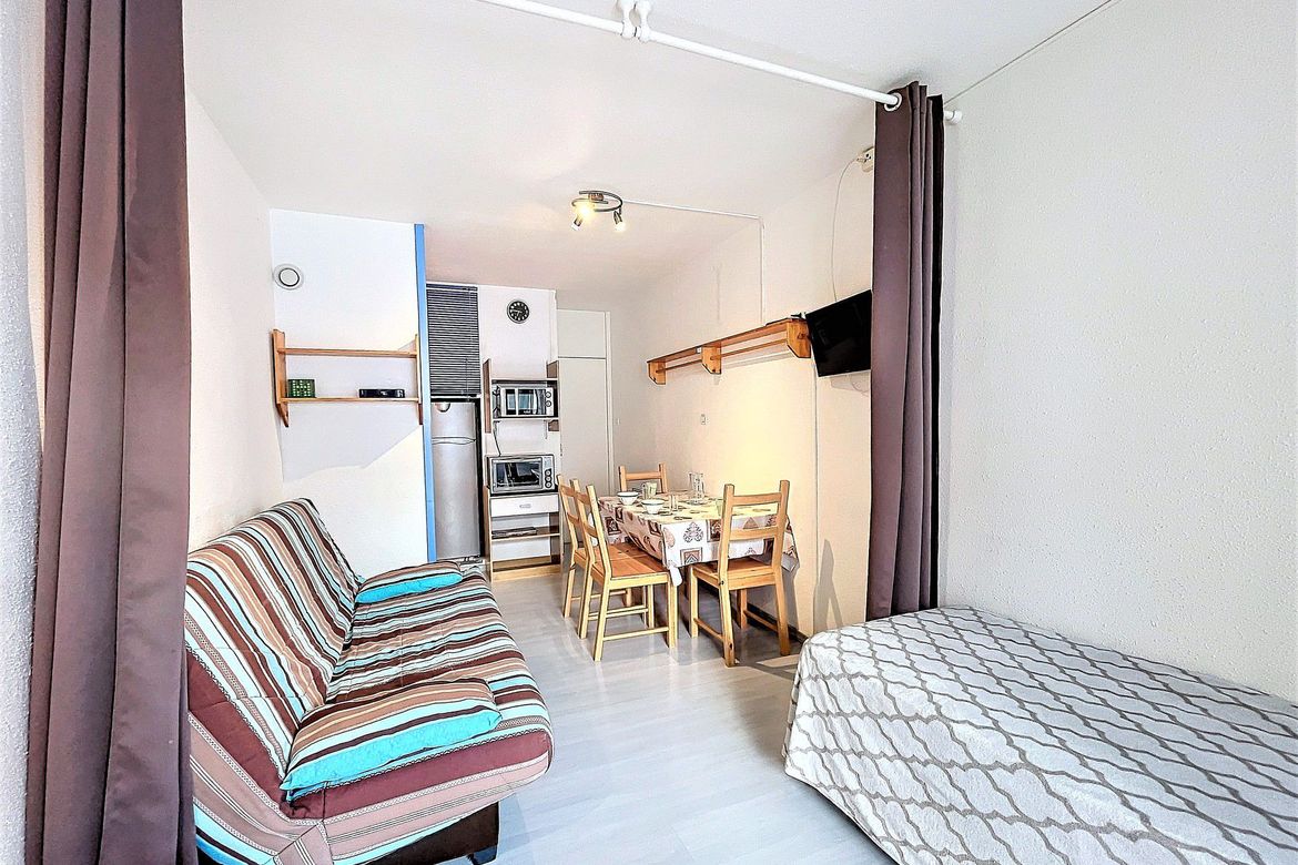 22m² studio for 4 people, located in Résidence Cosmos, on the 8th floor. Large south-facing balcony with a beautiful view of the ski slopes, right in the heart of the resort. Officially rated 1-star (French Ministry of Tourism). Pleasant and bright studio including an entrance with storage closet, a...