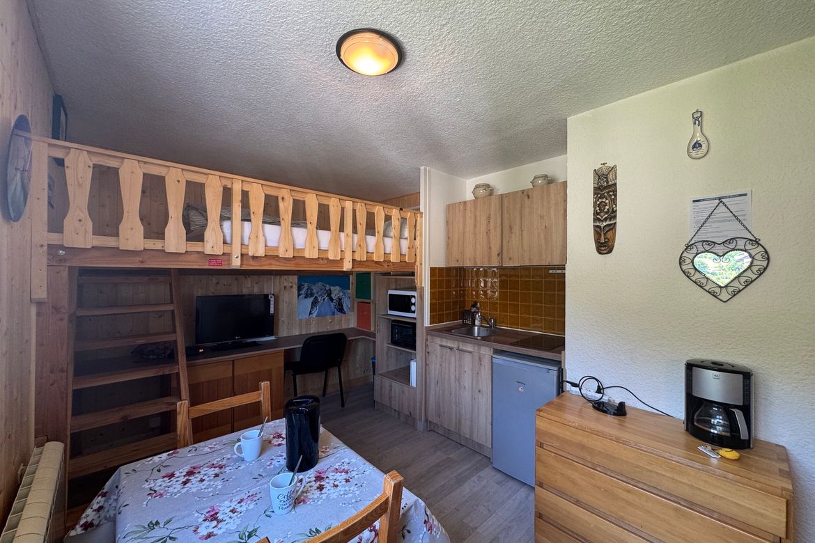 Studio of 18m2 for 2 or 3 persons, ideally located at the foot of the slopes in a residence at 5 minutes from the shops on foot and with a nice view on the mountains. It is composed of : - a closet in the entrance - a bathroom with bathtub and toilet - a living room with an equipped kitchenette (fr...