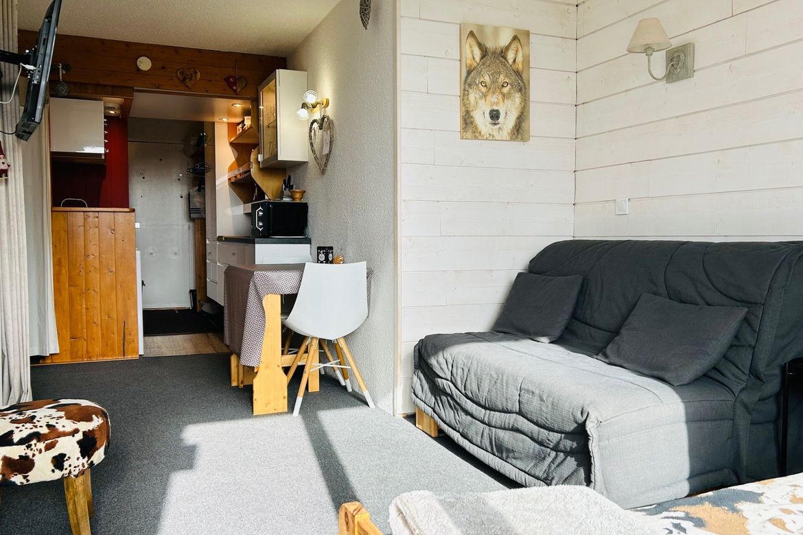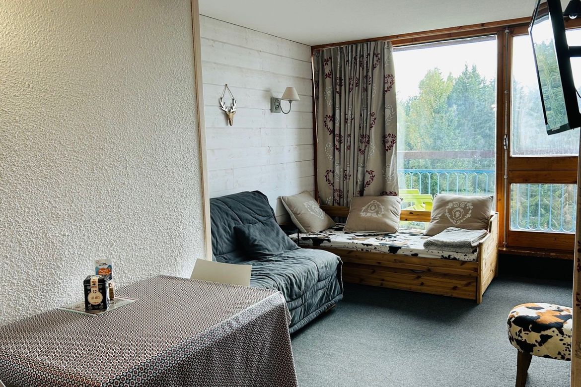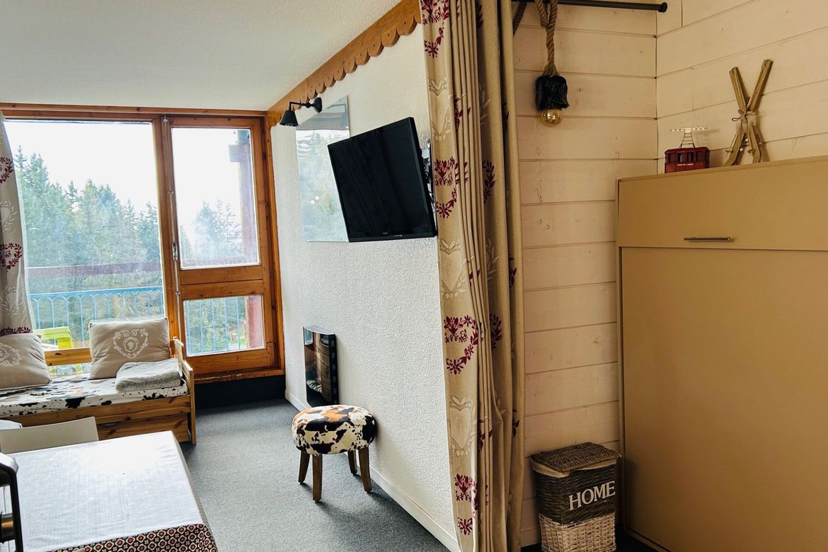 Studio cabine de 24m² pour 4 personnes, au 7ème étage de la résidence Belles Challes du Charvet, exposé Sud-Ouest, au pied des pistes et des commerces. Avec balcon Composé à l'entrée d'une salle de bain avec WC Séjour avec une alcôve et 1 canapé double mural permettant un couchage pour 2 personnes...