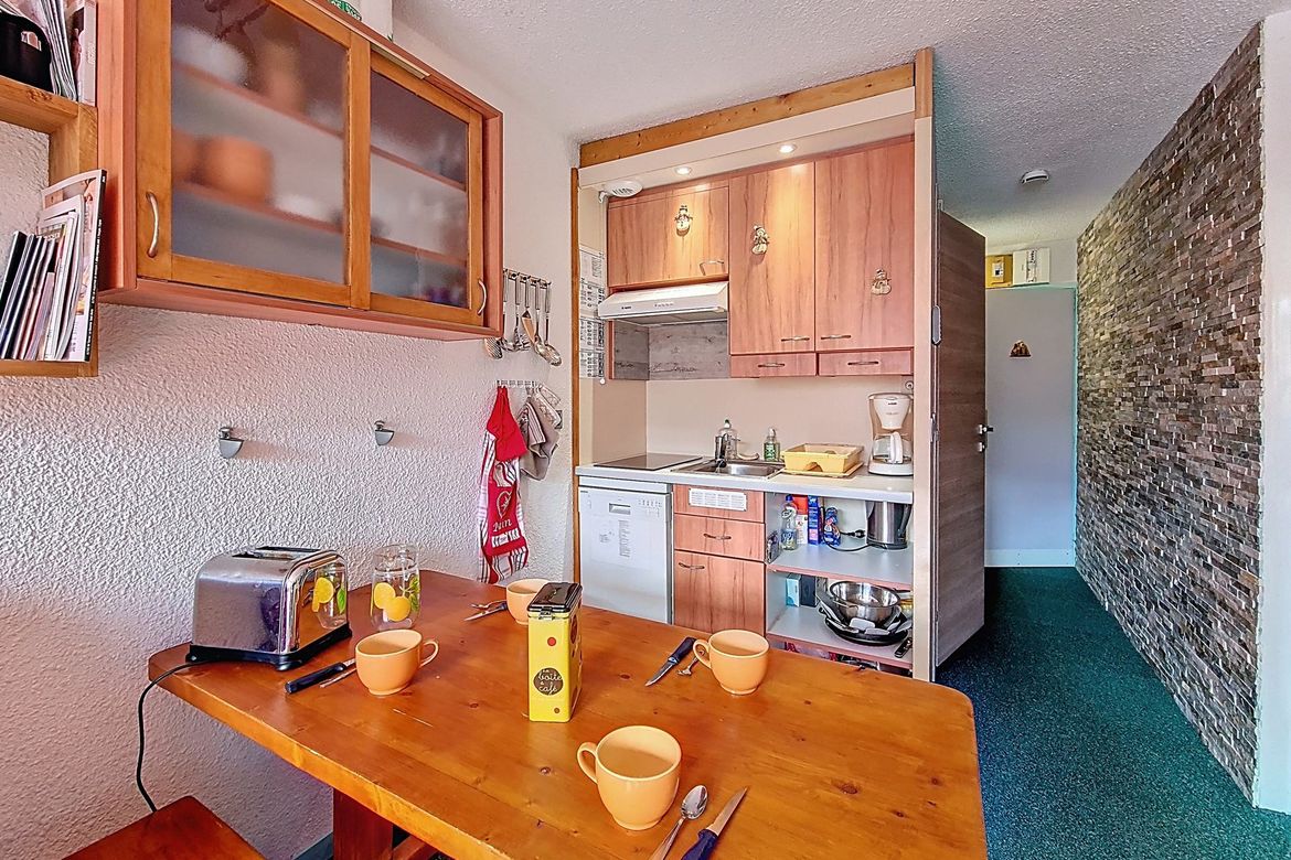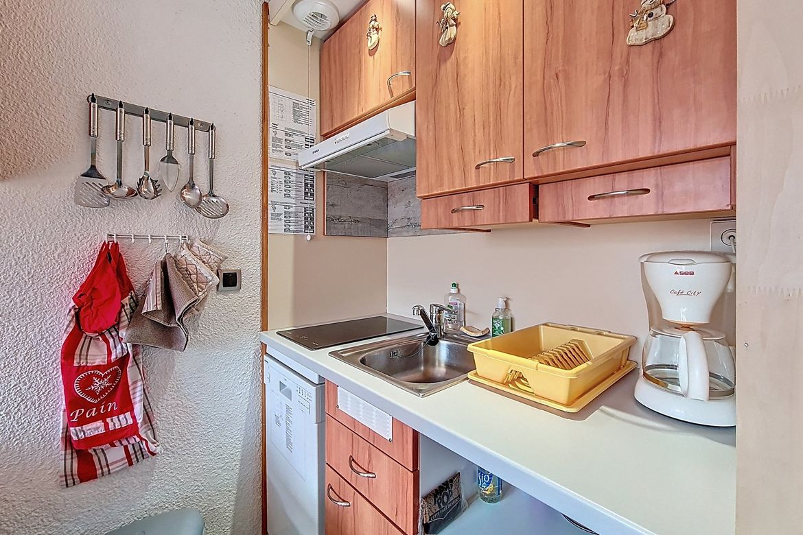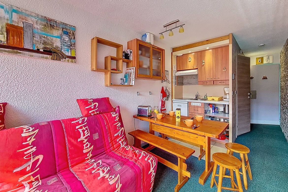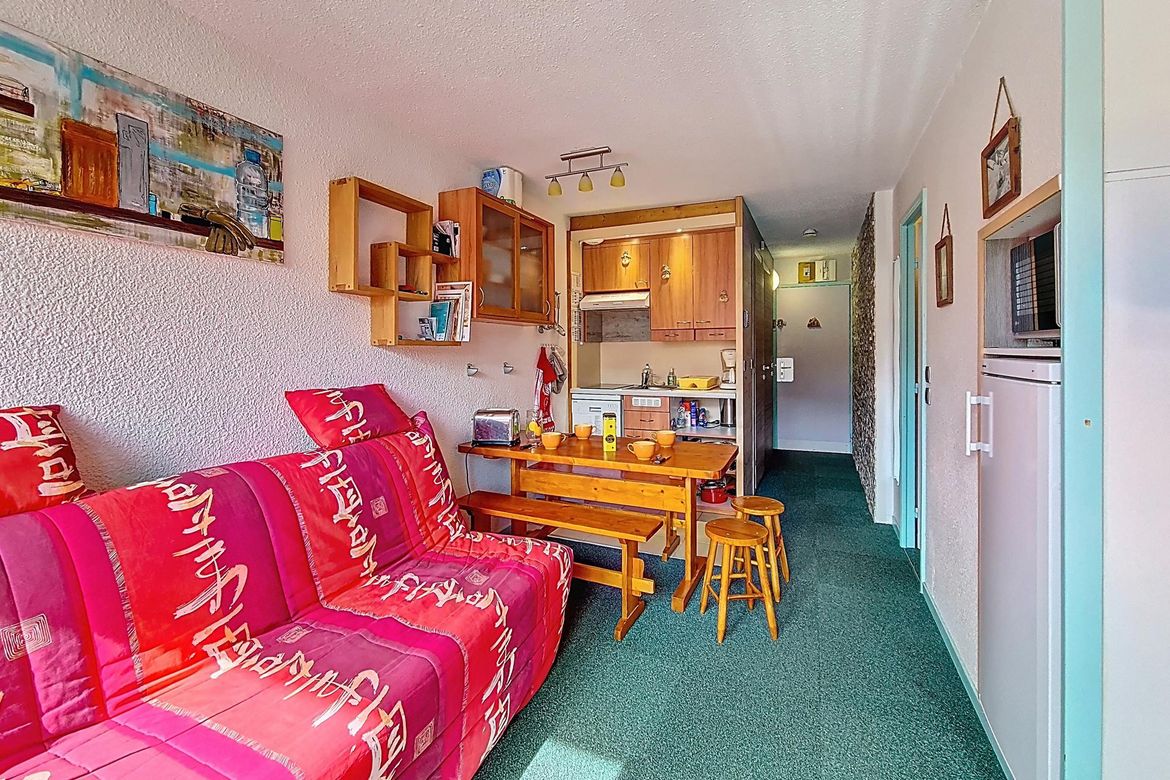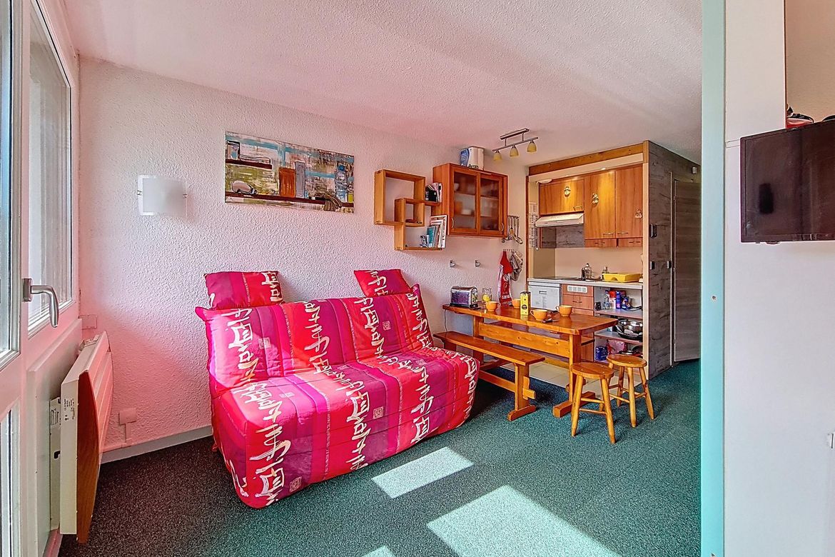 Pleasant 27 m² apartment for 4 people. It is located on the 6th floor and has a south-facing balcony. Label: pending Living room: Equipped with a sofa. Television. Fully equipped kitchen: refrigerator, 2 hotplates, extractor hood, microwave oven, dishwasher, coffee maker, kettle, and toaster. Be...