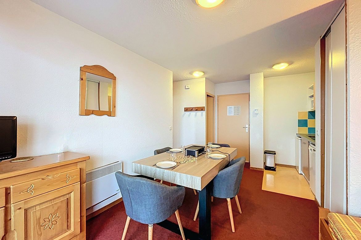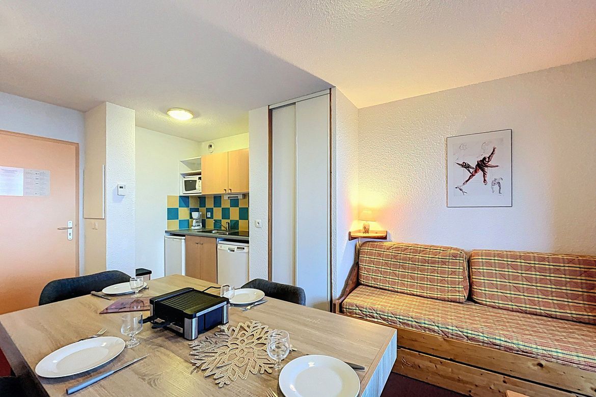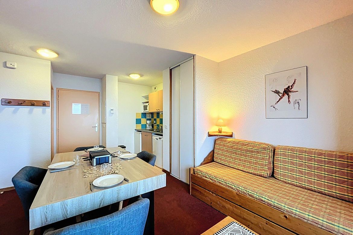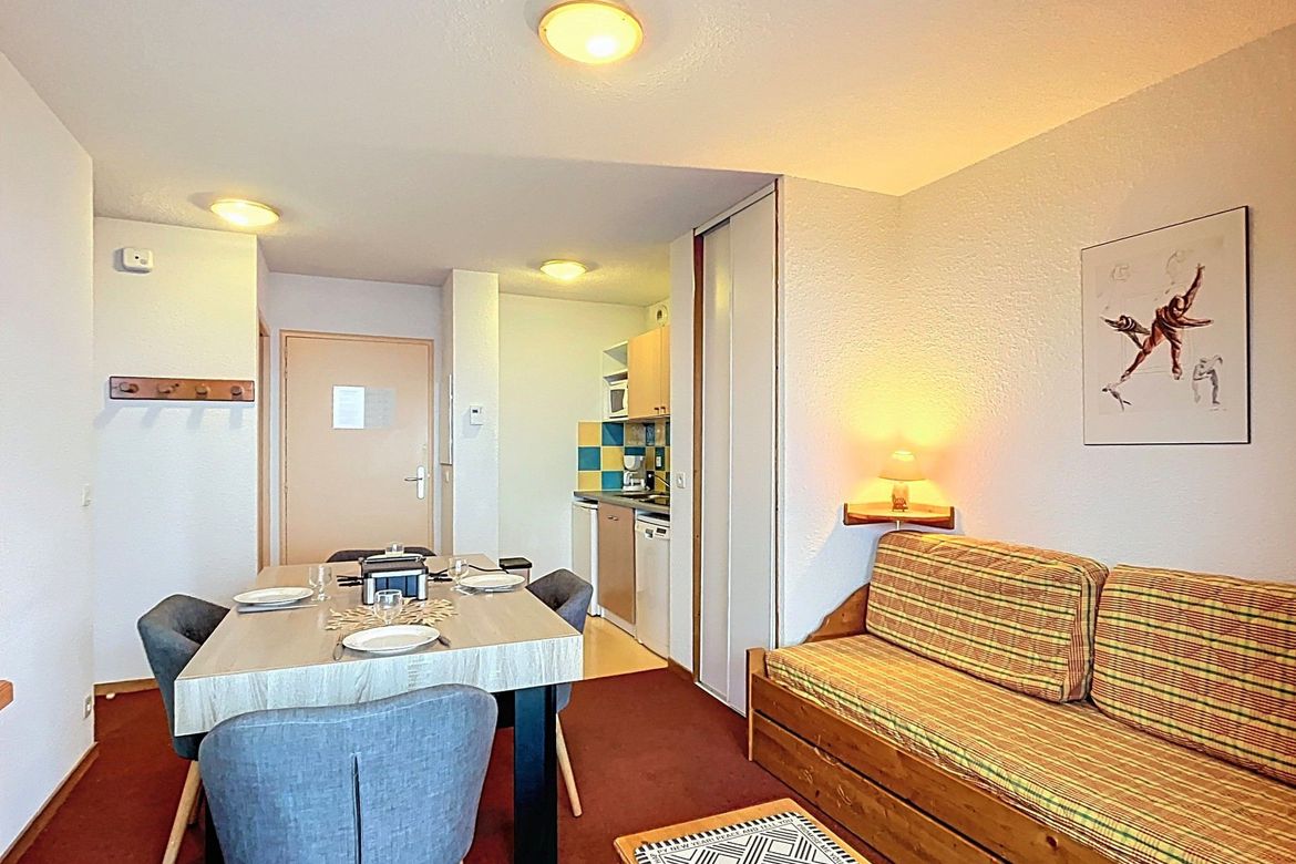 31 m² 1-bedroom apartment, accommodating up to 4 people, located in the “Les Pistes” residence on the 2nd floor. South-facing balcony. The apartment features a living room with a pull-out sofa bed for 2 people and a television. A kitchenette equipped with ceramic hobs, microwave, electric coffee ma...