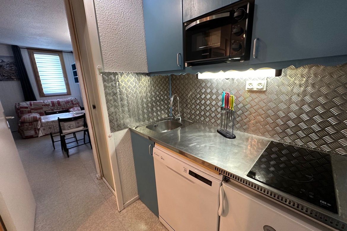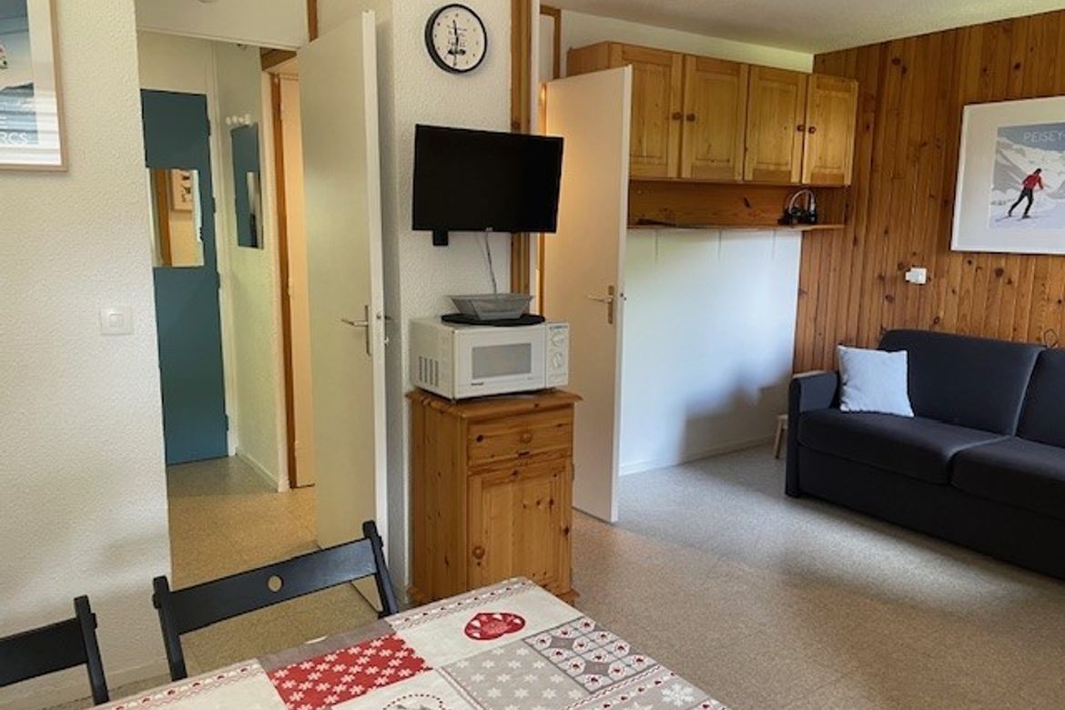 Situé dans la résidence du Crey, au pied de la télécabine de Montchavin. Studio bien situé d’une superficie de 24m2 au deuxième étage avec balcon orienté sud-ouest. Ce studio divisible avec une vue sur la montagne se compose d'une kitchenette équipée (lave-vaisselle, four, micro-ondes, cafetière, ...