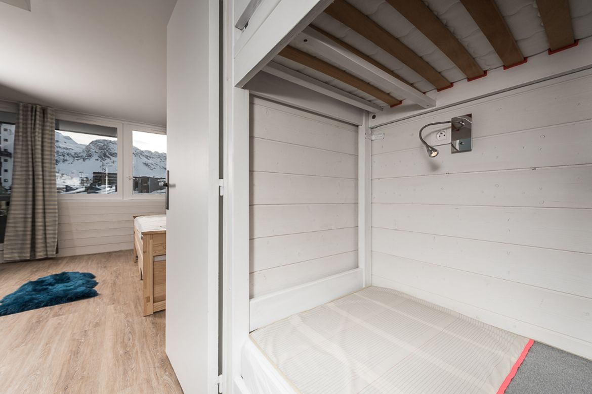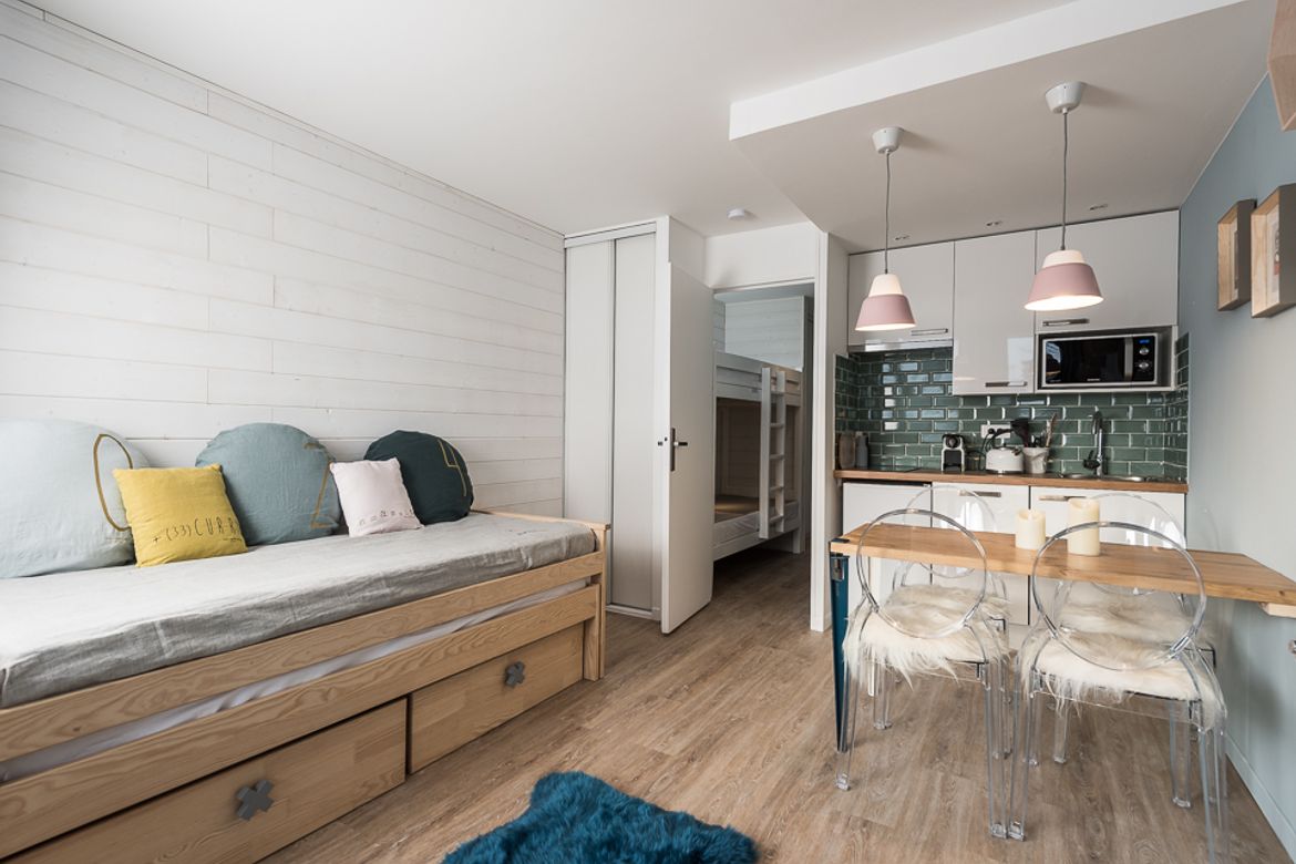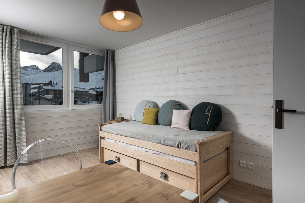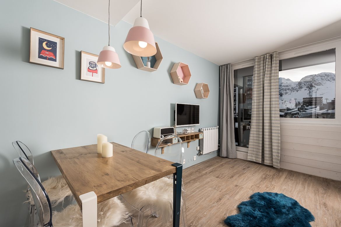 GAMME CONFORT Studio rénové de 24m² équipé pour 4 personnes et situé au 1er étage avec ascenseur de la résidence "Le Home Club", à Tignes le Lavachet. Exposition Sud avec balcon. Comprenant: Kitchenette équipée de plaques à induction, micro-ondes et lave-vaisselle Séjour avec coin repas, un lit t...