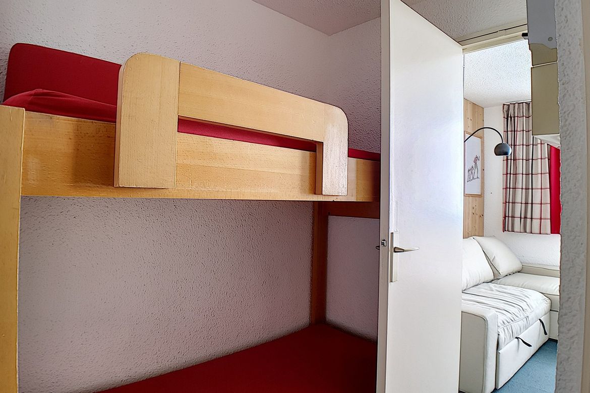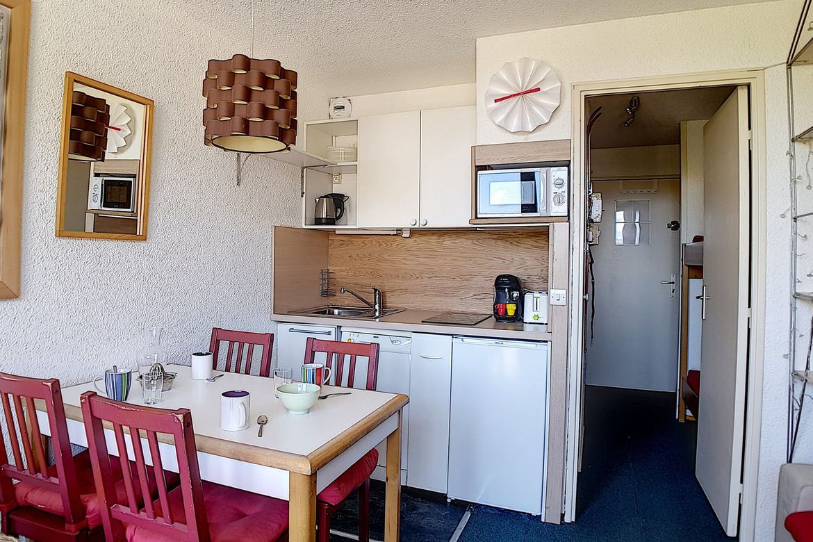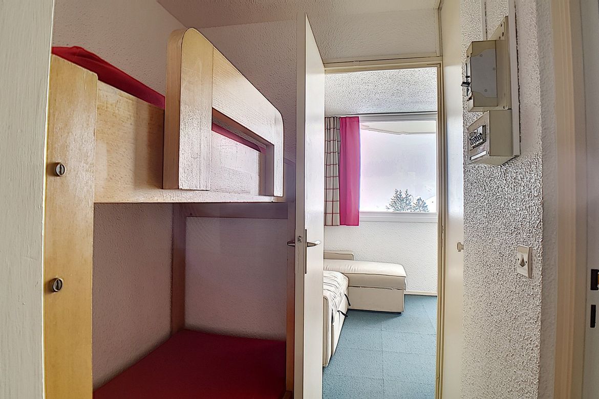 Studio avec coin cabine pour 3 personnes. Il est situé au 2ème étage avec ascenseur et dispose d'un balcon orienté Ouest. Label : 1 flocon Bronze Séjour : 1 canapé convertible avec méridienne pour 2 personnes (140cm). Equipé d'une télévision. Coin cabine dans l'entrée : 1 lit simple. le lit su...