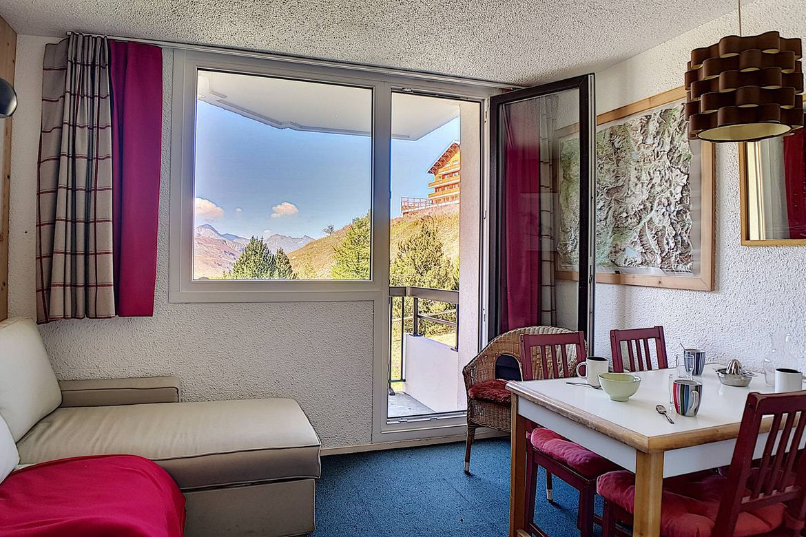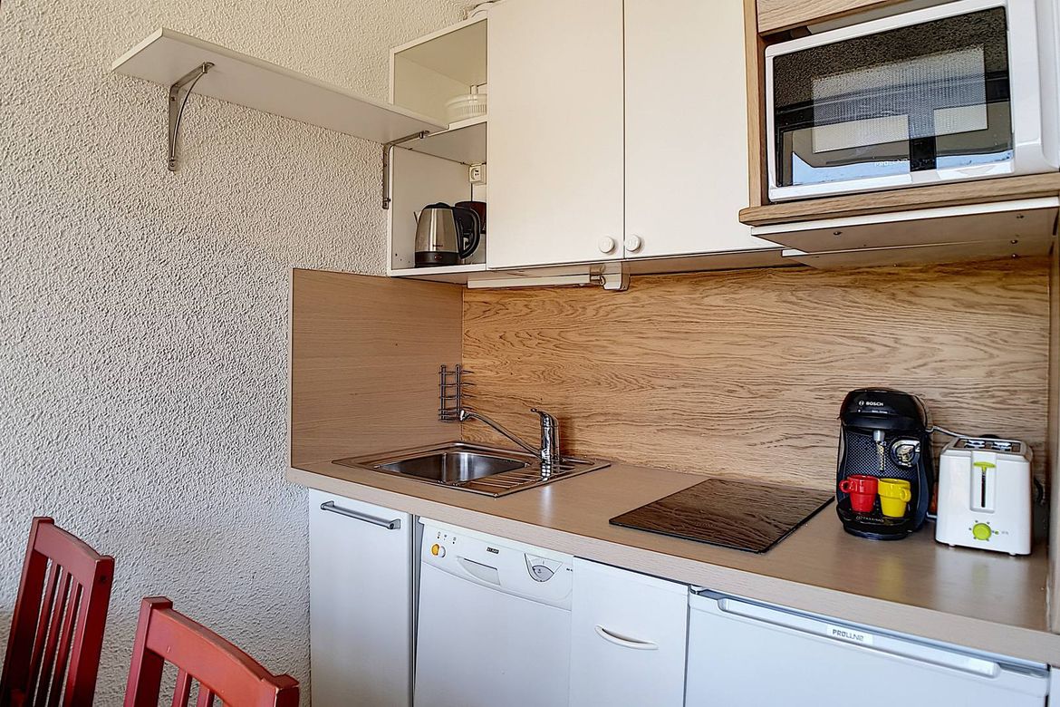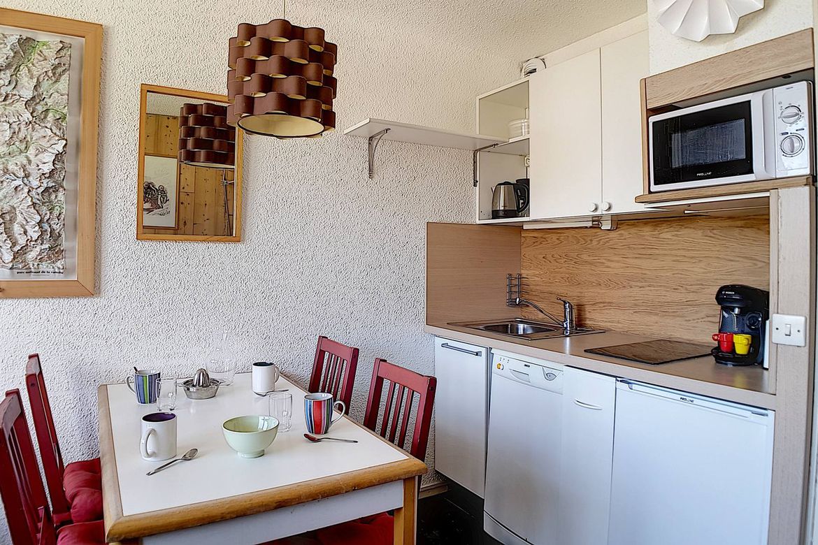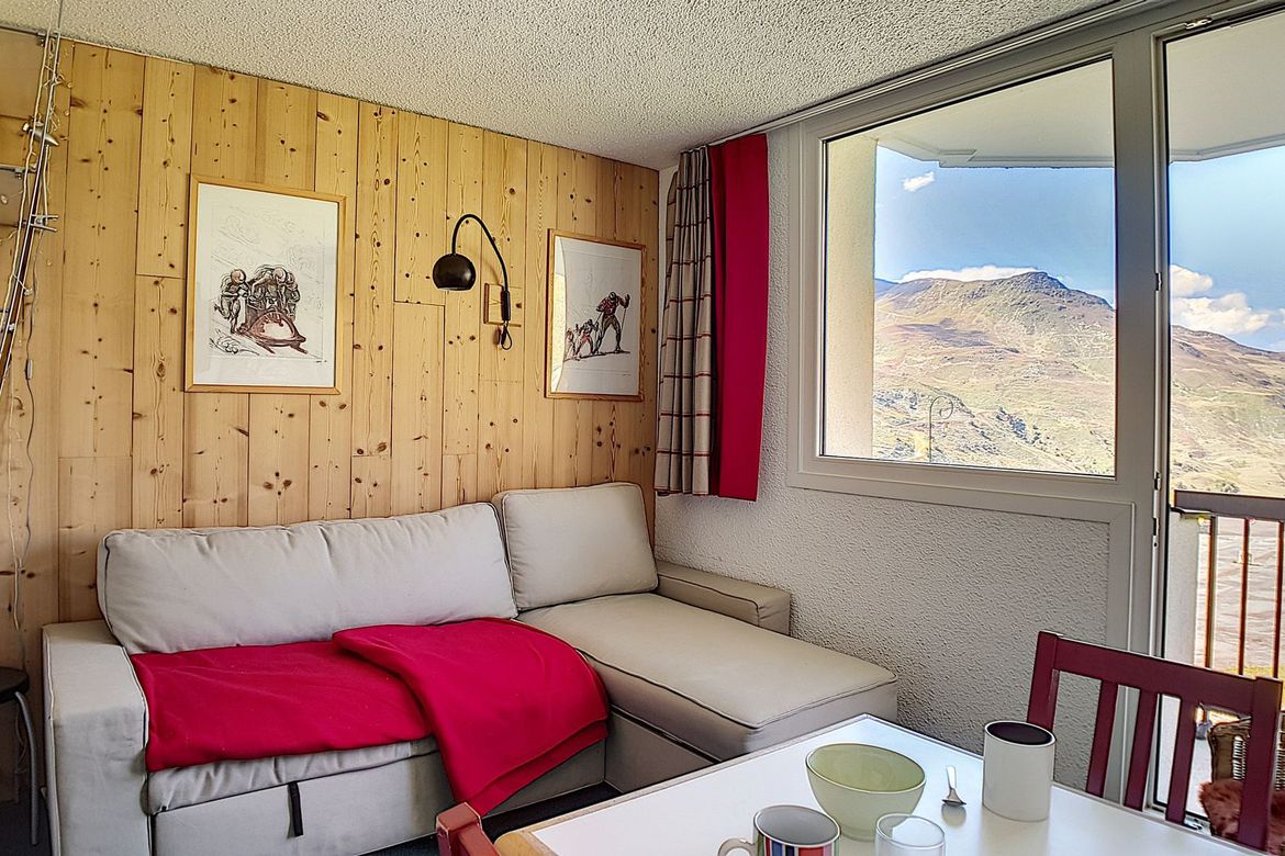 Studio avec coin cabine pour 3 personnes. Il est situé au 2ème étage avec ascenseur et dispose d'un balcon orienté Ouest. Label : 1 flocon Bronze Séjour : 1 canapé convertible avec méridienne pour 2 personnes (140cm). Equipé d'une télévision. Coin cabine dans l'entrée : 1 lit simple. le lit su...