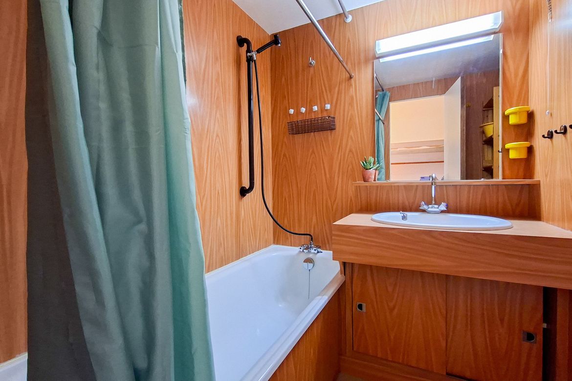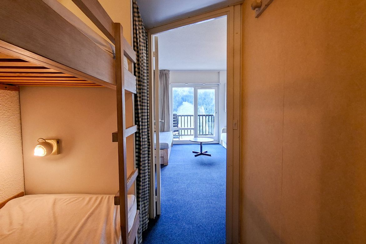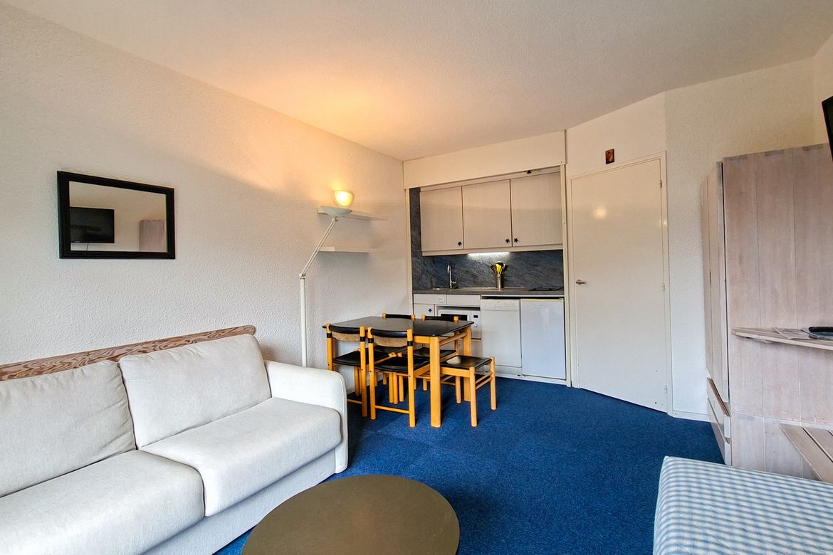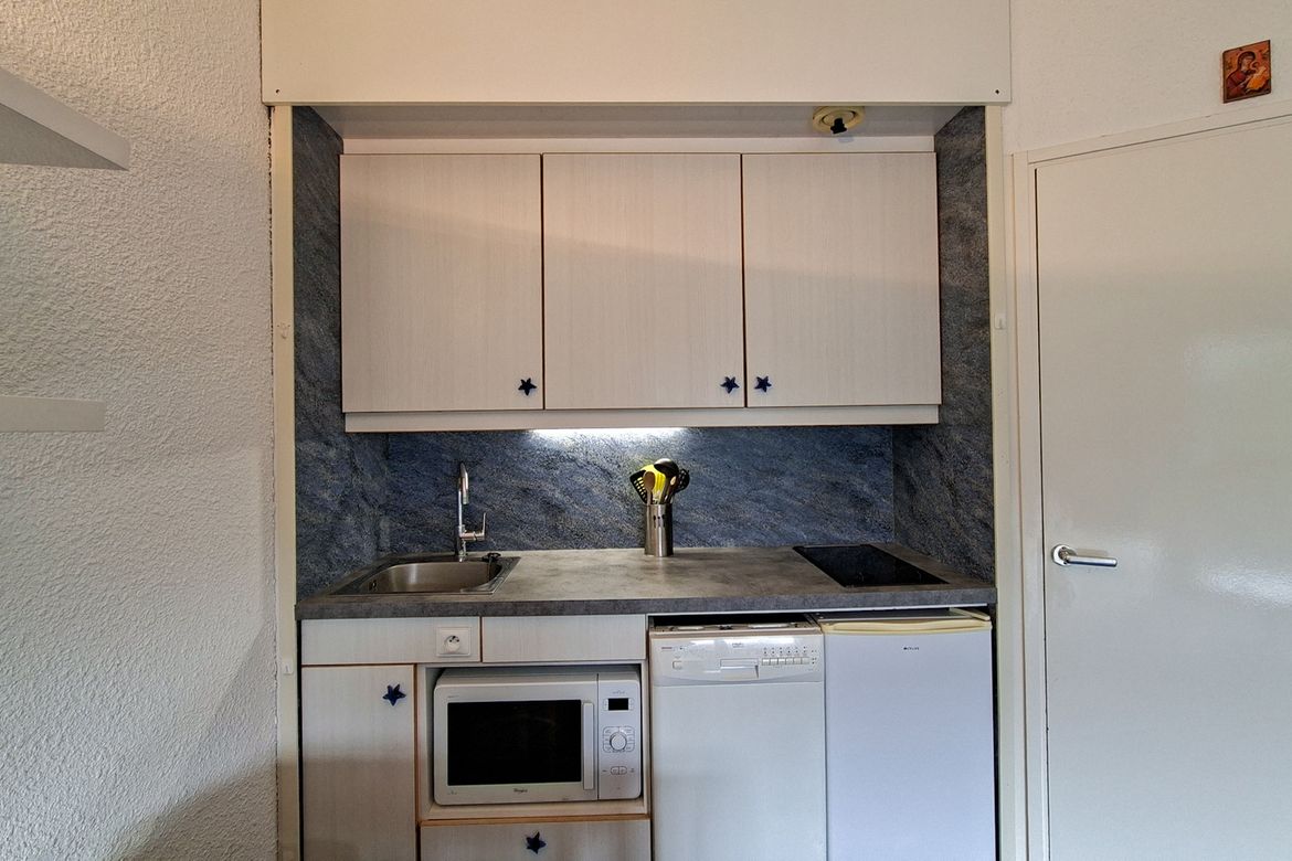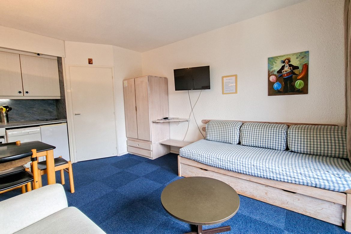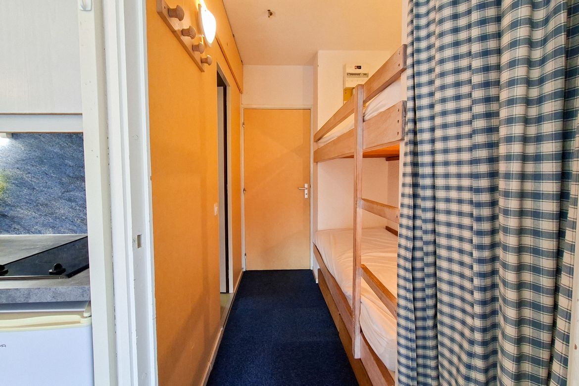 Studio Sud Confort 25 m2 au 5ème étage avec balcon Sol moquette et linoleum Equipé pour 4 personnes - Entrée : 1 jeux de lits superposés - Séjour : 1 canapé lit 2 personnes (140x190cm) - Télévision à écran plat - Salle de bain avec baignoire et toilettes - Kitchenette avec lave-vaisselle, 2 plaque...