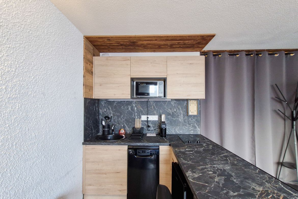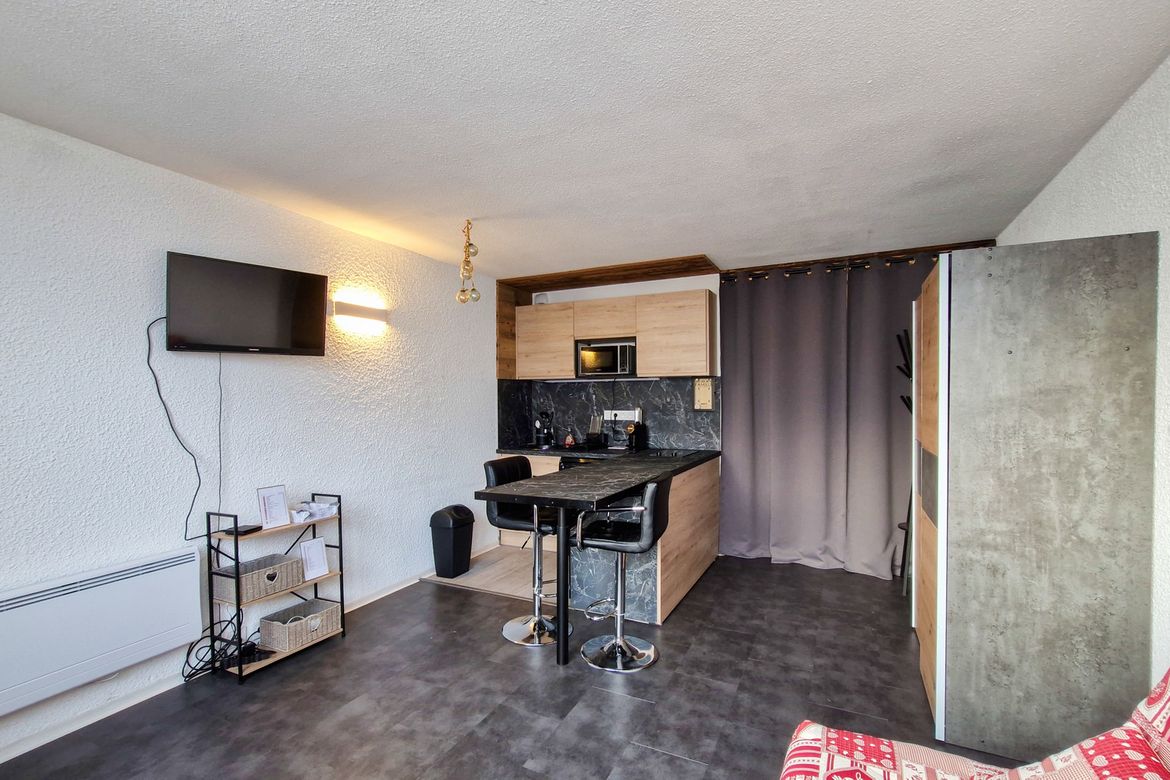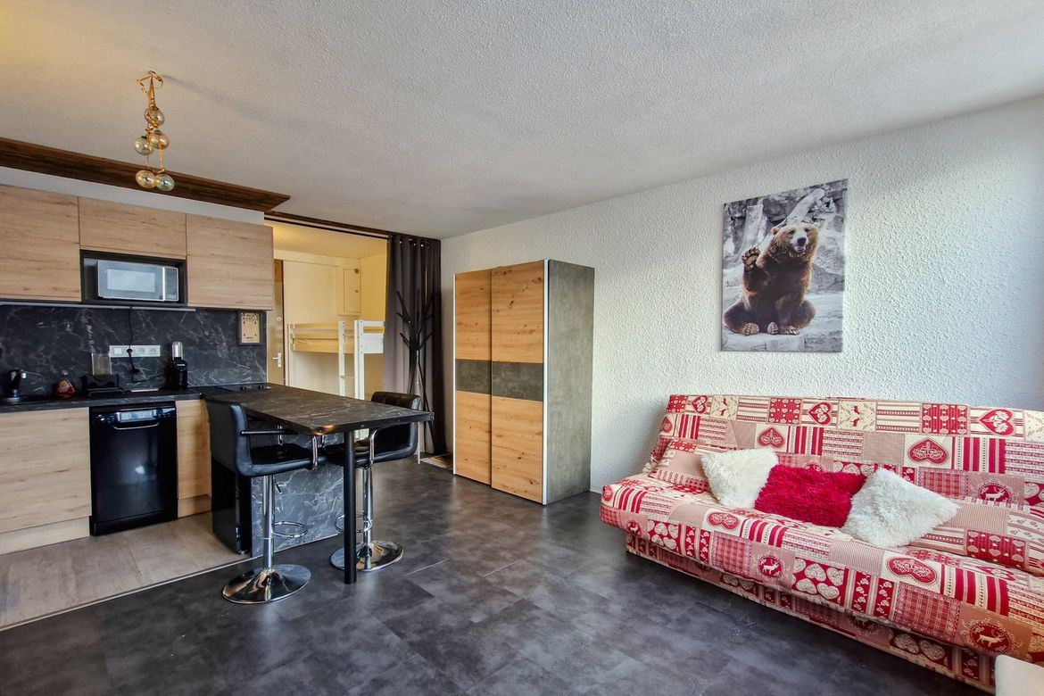 Studio Sud 25 m2 entièrement rénové au 3e étage sans ascenseur, balcon Sud - Equipé pour 4 personnes - Séjour : canapé lit 2 places clic-clac et 2 lits superposés (rideau de séparation) - Télévision - Salle de douche avec toilettes - Cuisine dans la salle de séjour avec réfrigérateur, 2 plaques...