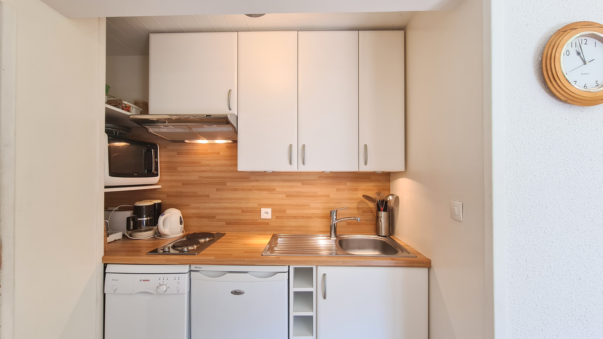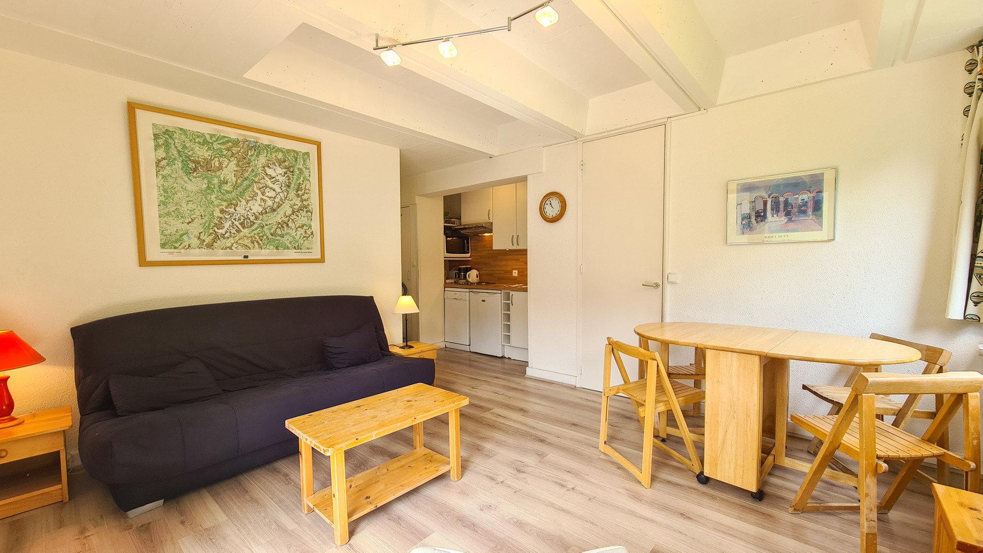 Studio cabine 28 m2 au 8ème étage, avec balcon Est, entièrement rénové Sol parquet - Equipé pour 4 personnes - Cabine (avec fenêtre) : 1 jeux de lits superposés - Séjour : 1 canapé lit 2 places - Avec télévision écran plat - Salle de bain avec baignoire et WC - Kitchenette neuve avec lave-vaissell...