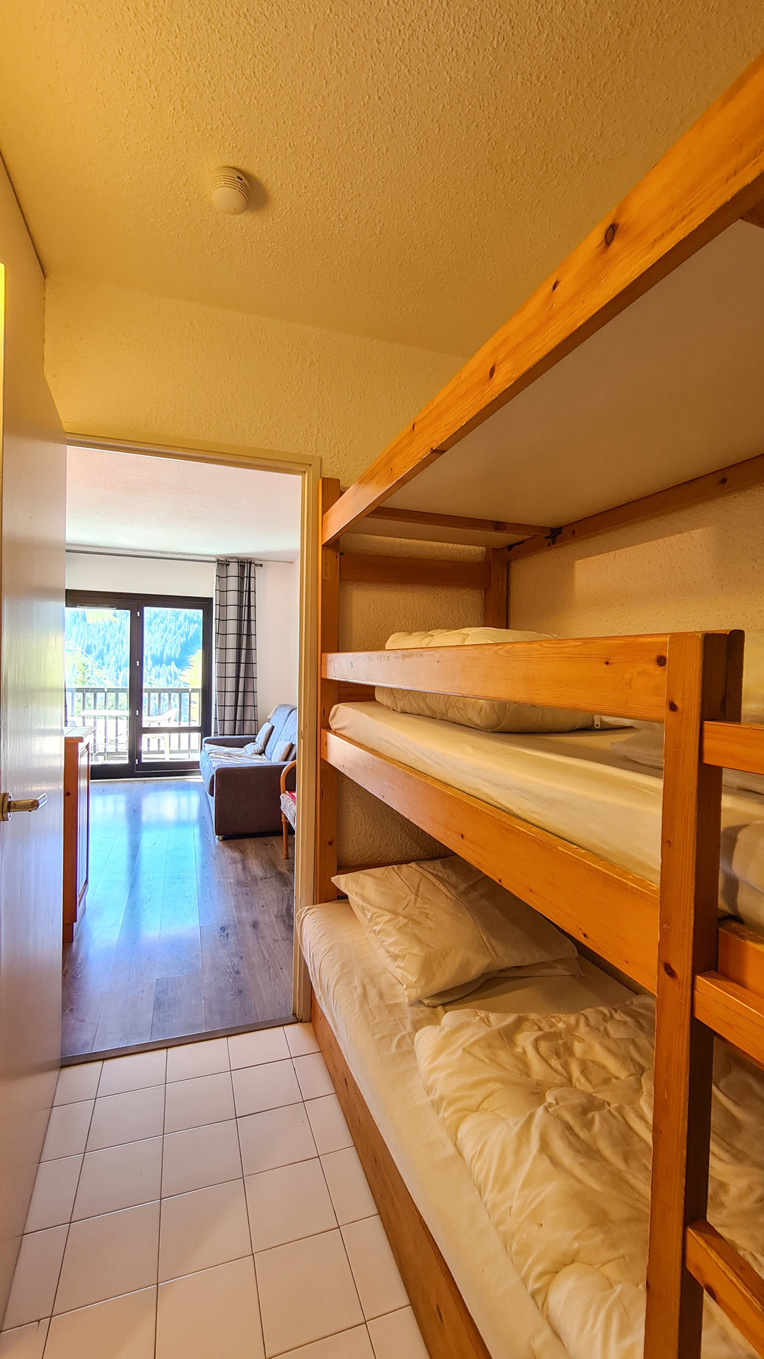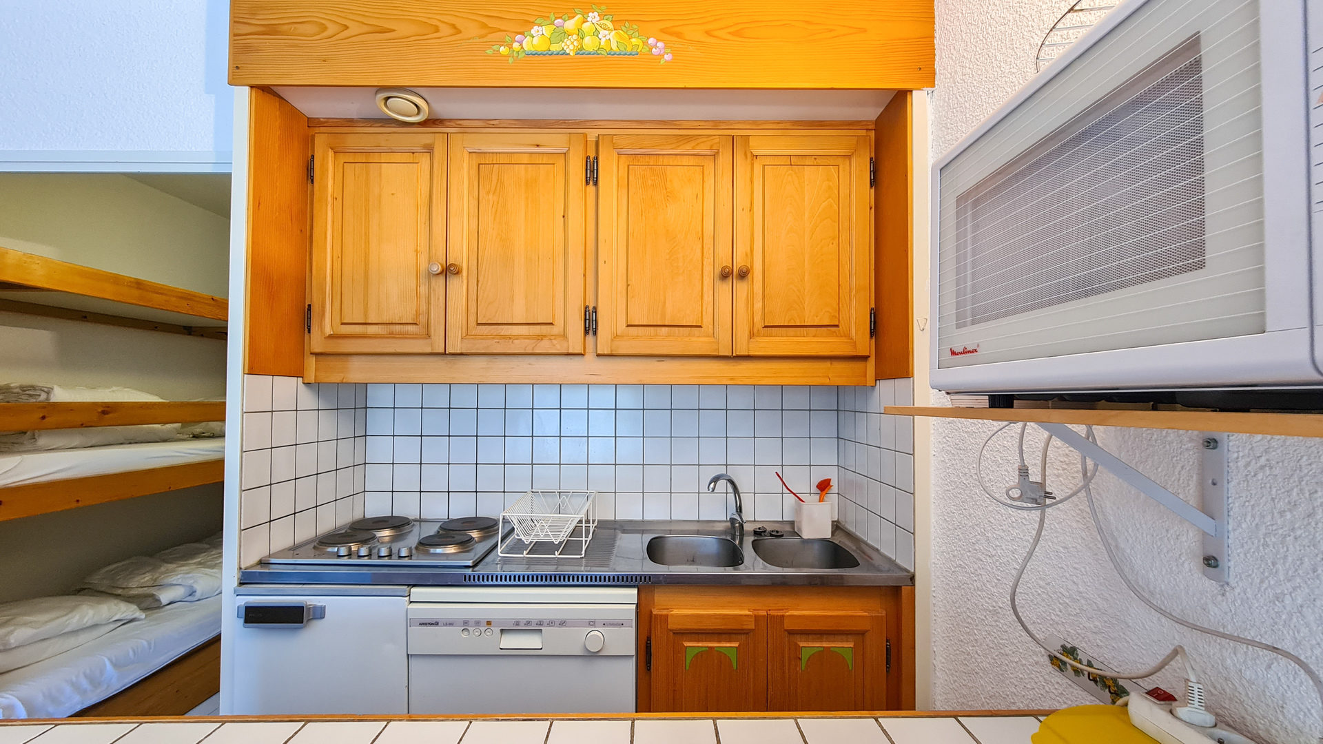 Studio Confort 25 m2 au 2ème étage avec balcon Sud Sol parquet et carrelage Equipé pour 4 personnes - Entrée : 1 jeux de lits superposés - Séjour : canapé lit 2 places - Télévision écran plat - Salle de douche avec toilettes et radiateur sèche serviette - Kitchenette avec 4 plaques électriques, lav...