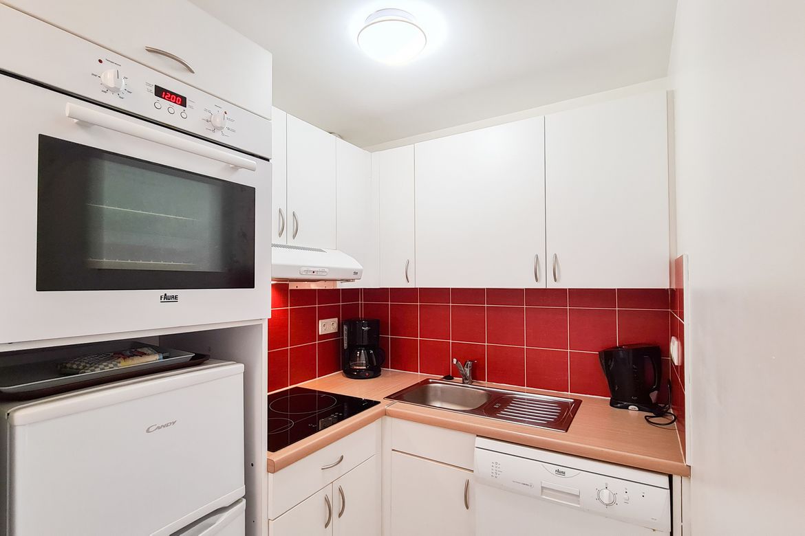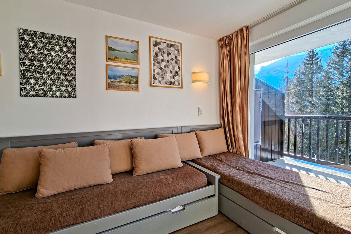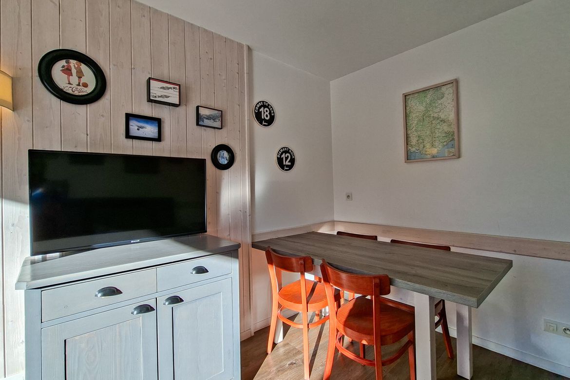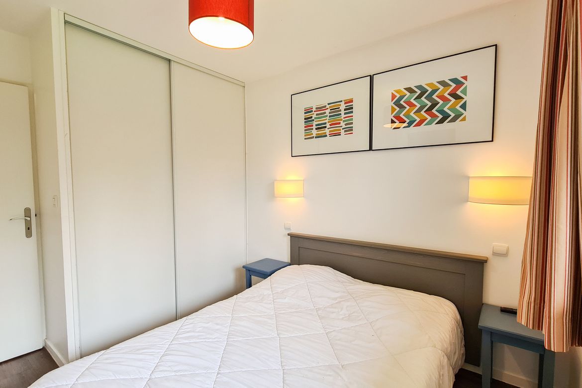 2 pièces Sud équipé pour 4 personnes 32 m2 avec grand séjour en rez-de-jardin avec balcon sud sans vis à vis - Séjour: 1 banquette lit 1 personne + lit gigogne - Chambre avec 1 lit 2 personnes (140x190) - TV écran plat avec chaînes câblées dans le salon et dans la chambre - Salle de bain avec baigno...