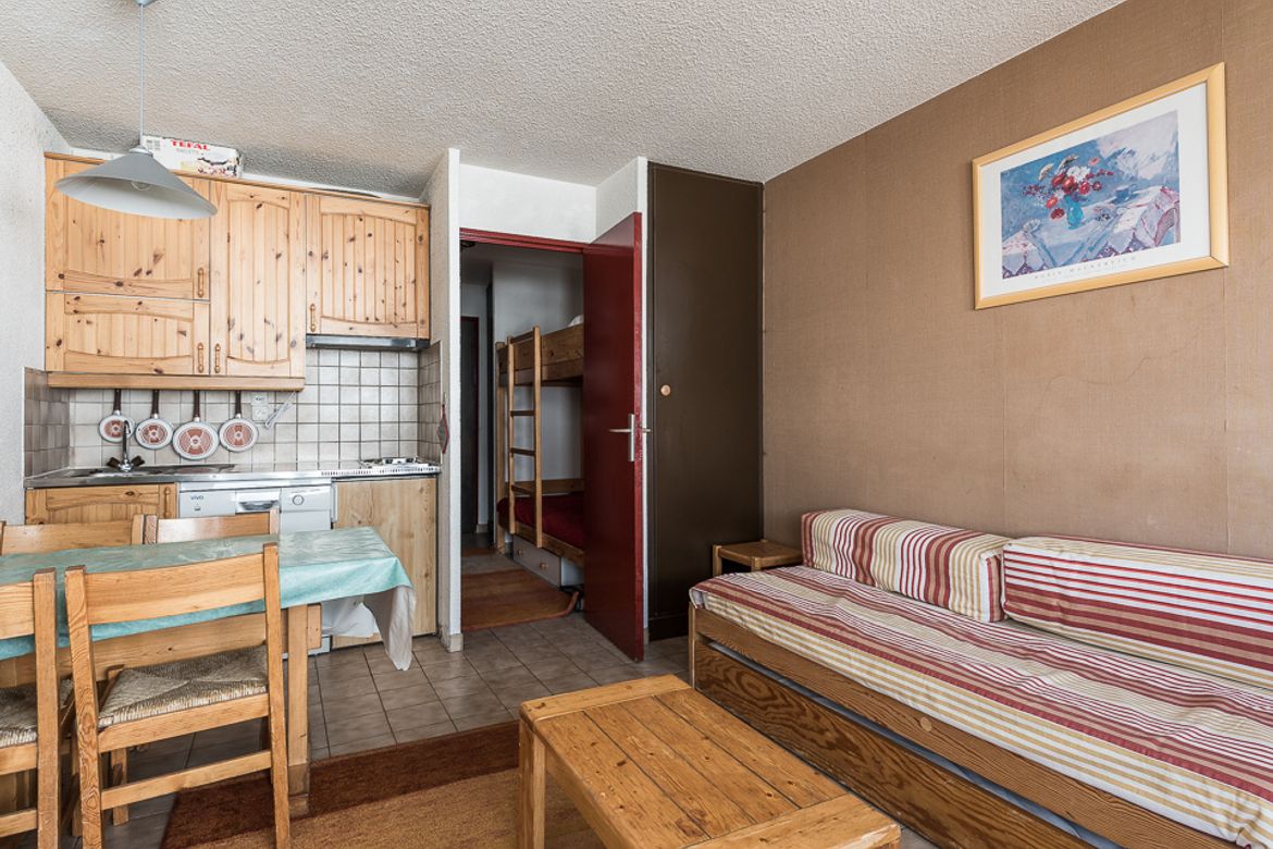 GAMME ESSENTIELLE Studio de 24m² équipé pour 4 personnes et situé au 2ème étage avec ascenseur de la résidence "Le Home Club", à Tignes Le Lavachet. Exposition Sud avec balcon. Comprenant: Cuisine avec plaques électriques, micro-ondes et lave-vaisselle Séjour avec un canapé lit giogogne (2 coucha...