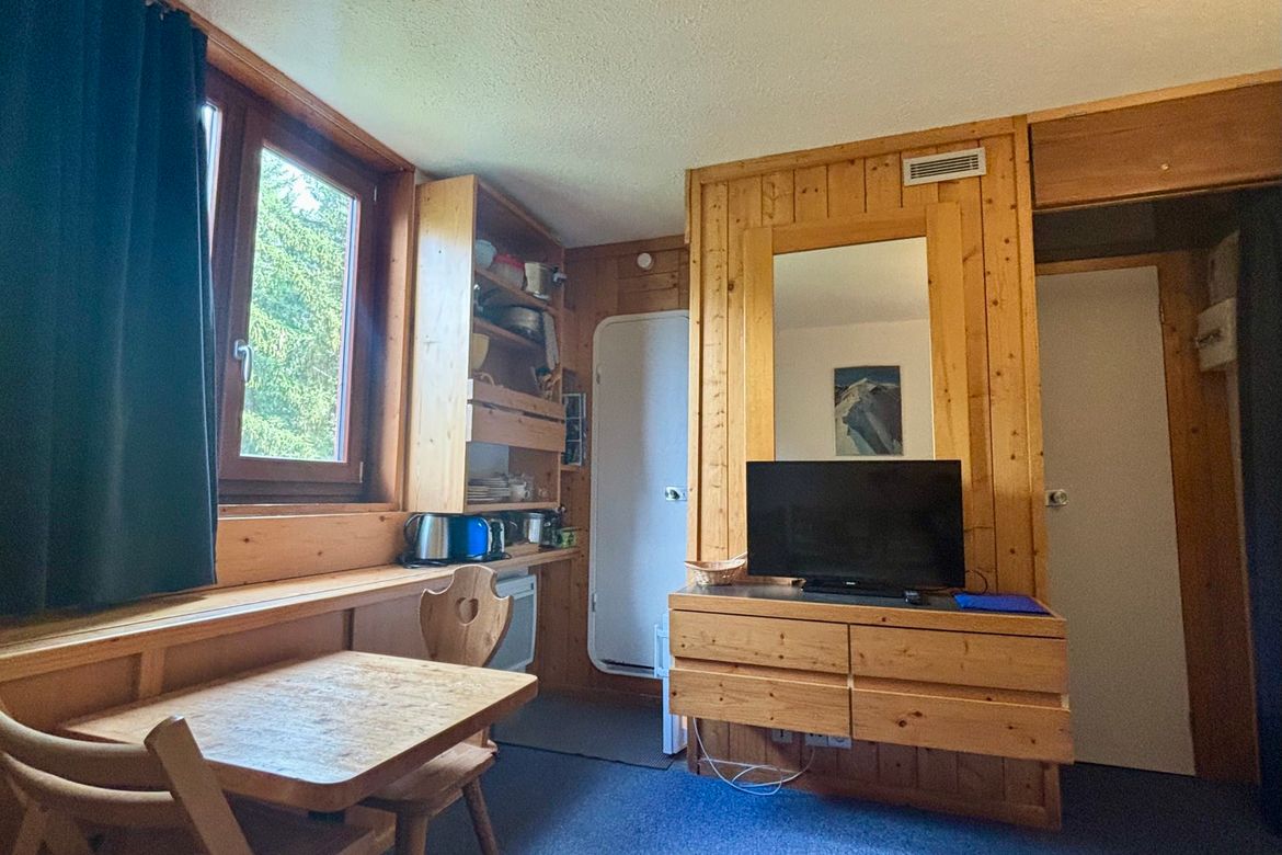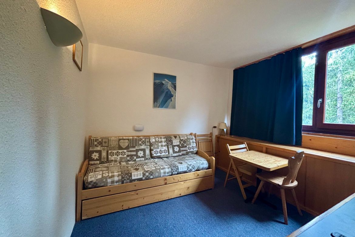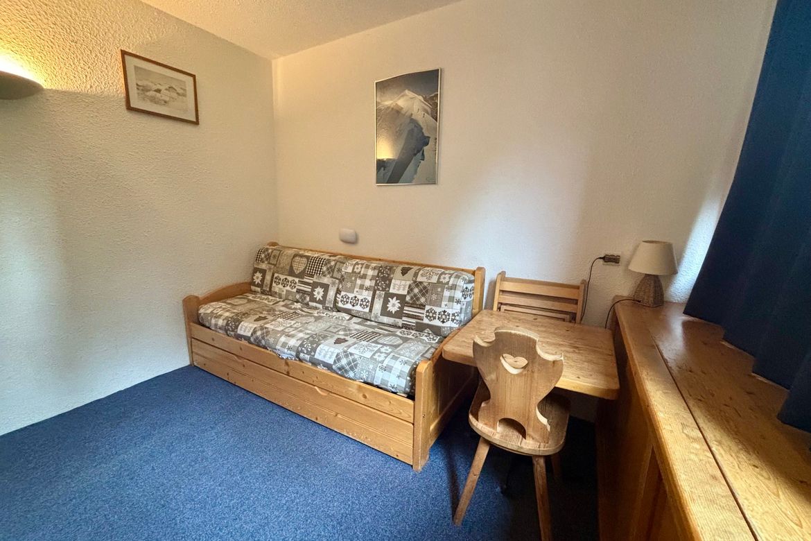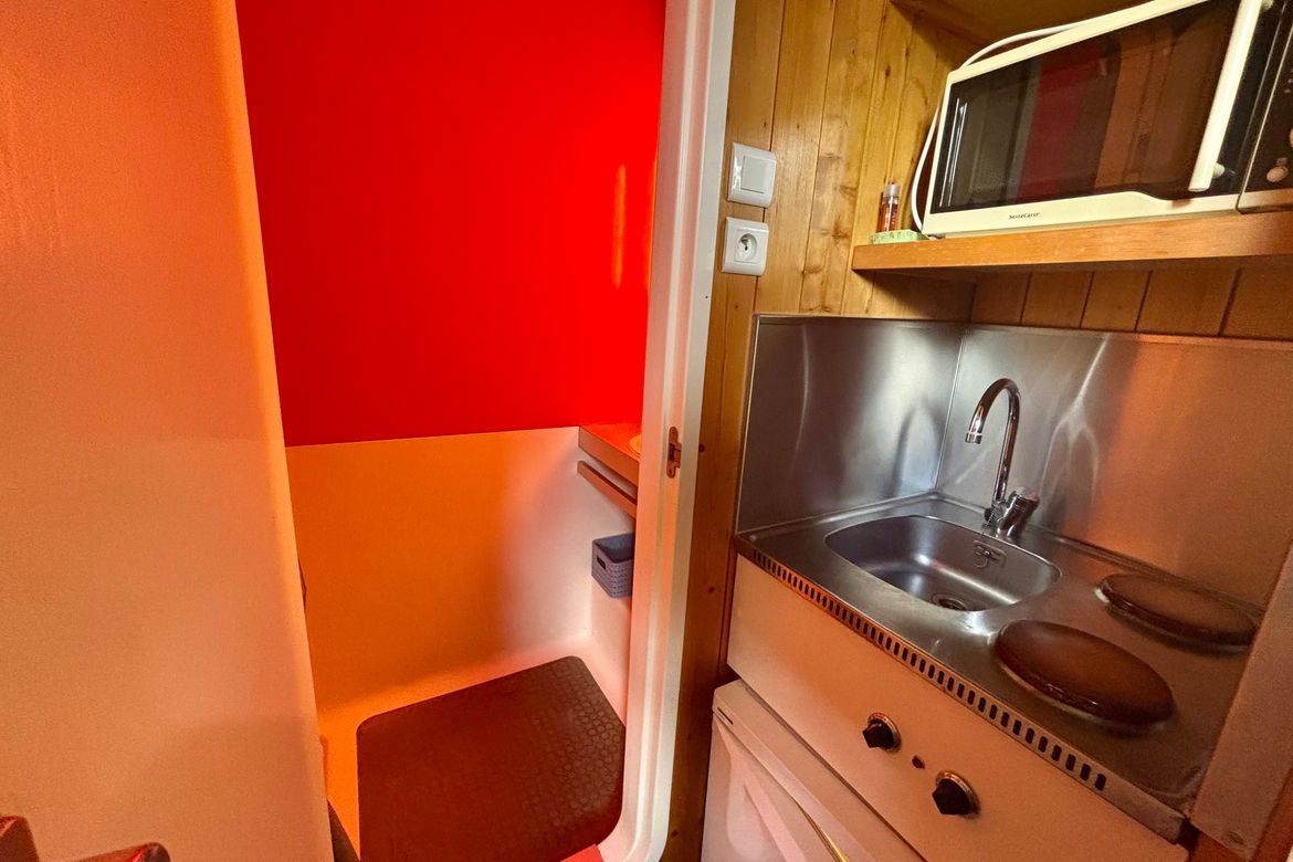Studette de 13m², meublée pour deux personnes, située au 10ème étage de la résidence Nova 3, au coeur de la station, exposition Nord et pas de balcon Séjour équipé d'une banquette lit et d'un lit gigogne en 80cm et une TV Kitchenette comprenant : 2 plaques électriques, four combiné (micro-ondes + ...