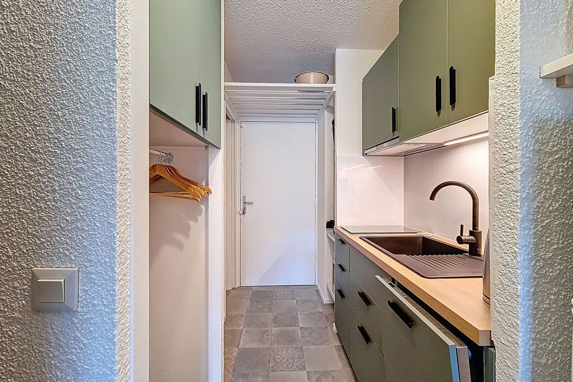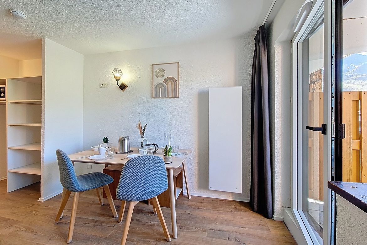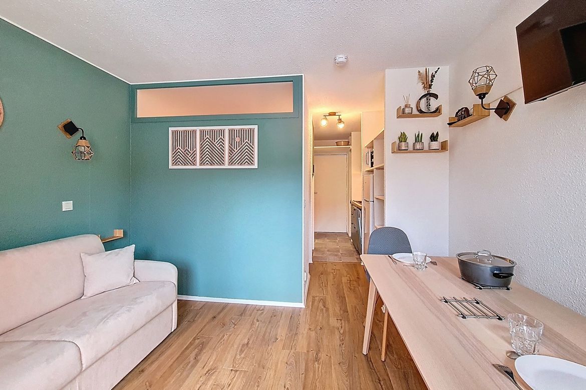 Studio de 23 m² situé au 6éme étage d'une résidence, idéal pour accueillir jusqu'à 4 personnes. Il dispose d’un balcon exposé plein sud, offrant une vue dégagée. Label : 2 Flocons Argent Séjour : équipé d’un canapé convertible pour 2 personnes et d'une télévision. Cuisine ouverte équipée avec 2 plaq...