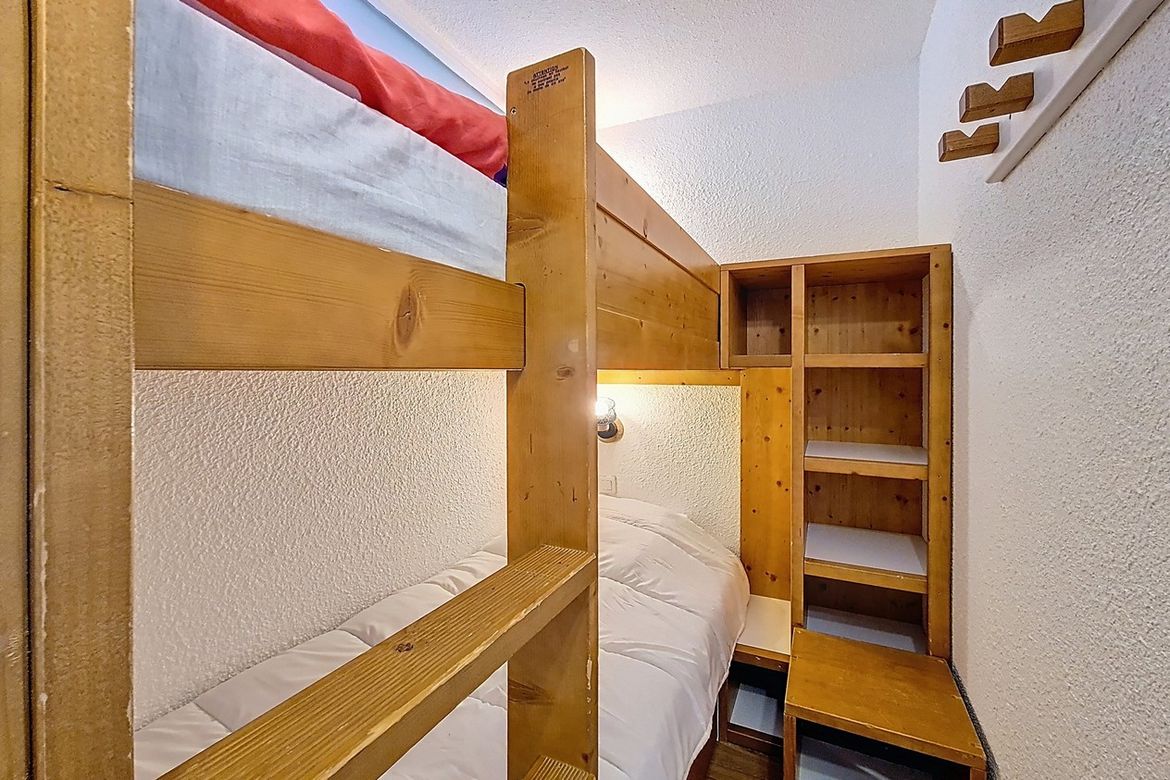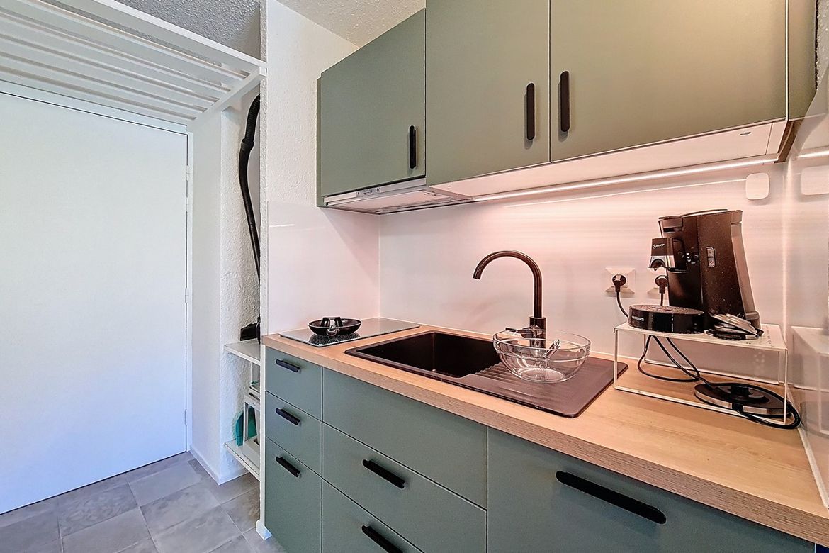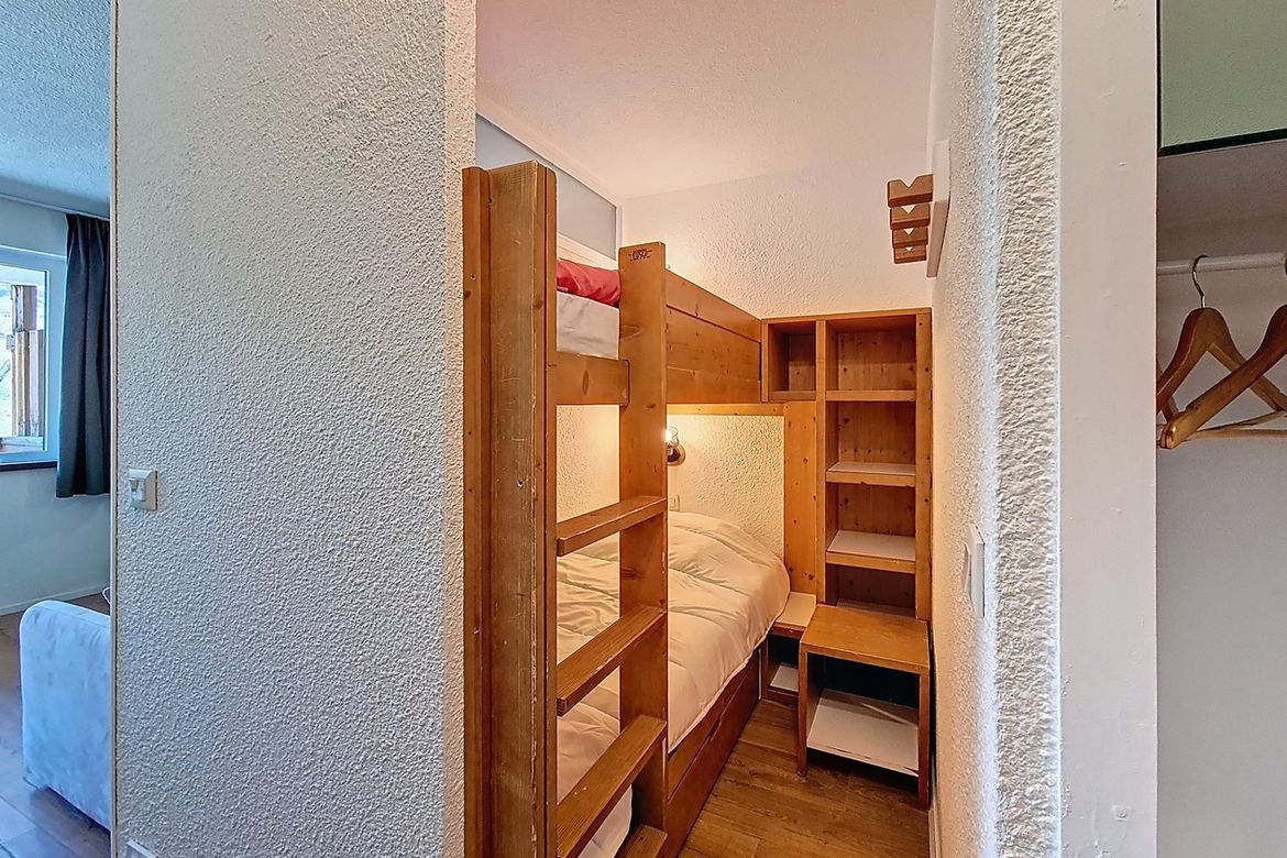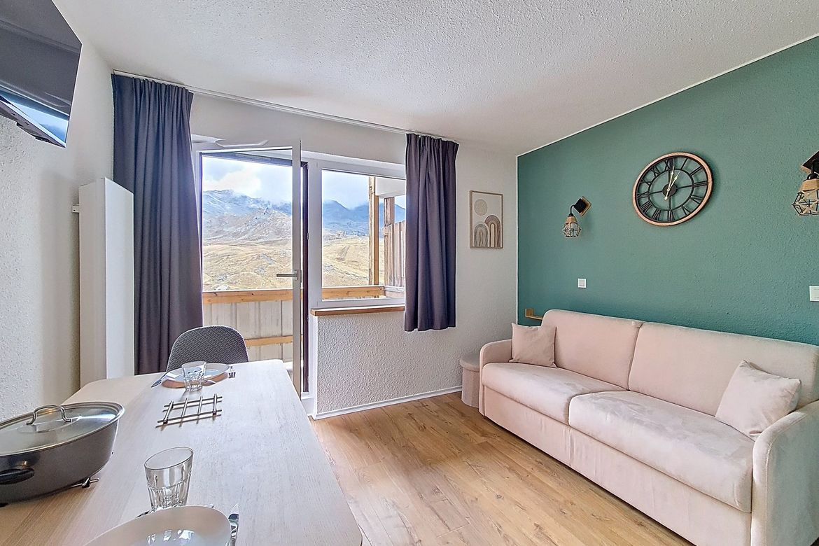 Studio de 23 m² situé au 6éme étage d'une résidence, idéal pour accueillir jusqu'à 4 personnes. Il dispose d’un balcon exposé plein sud, offrant une vue dégagée. Label : 2 Flocons Argent Séjour : équipé d’un canapé convertible pour 2 personnes et d'une télévision. Cuisine ouverte équipée avec 2 plaq...