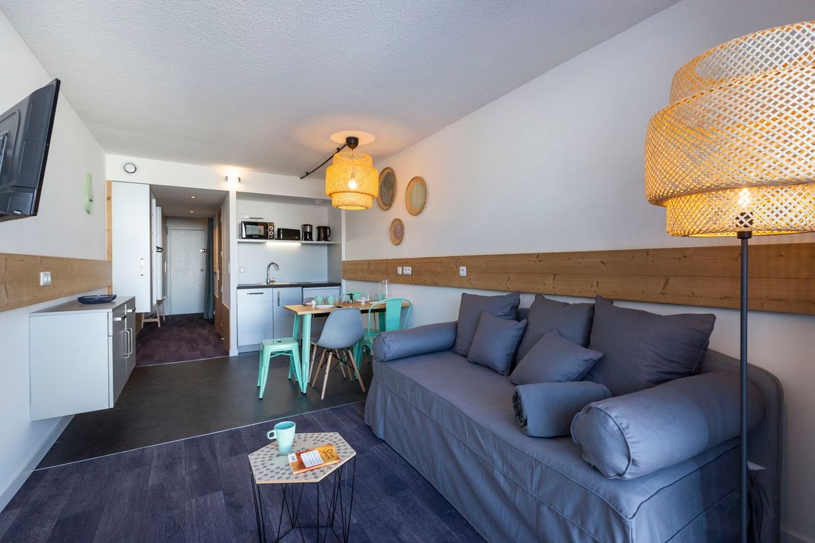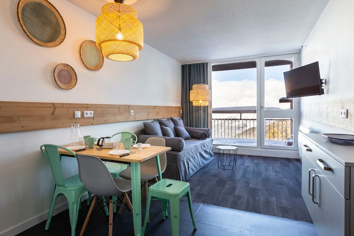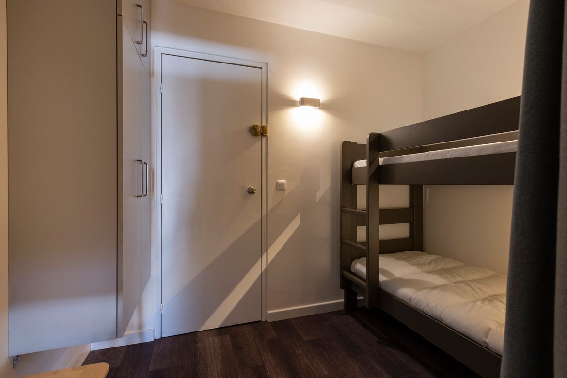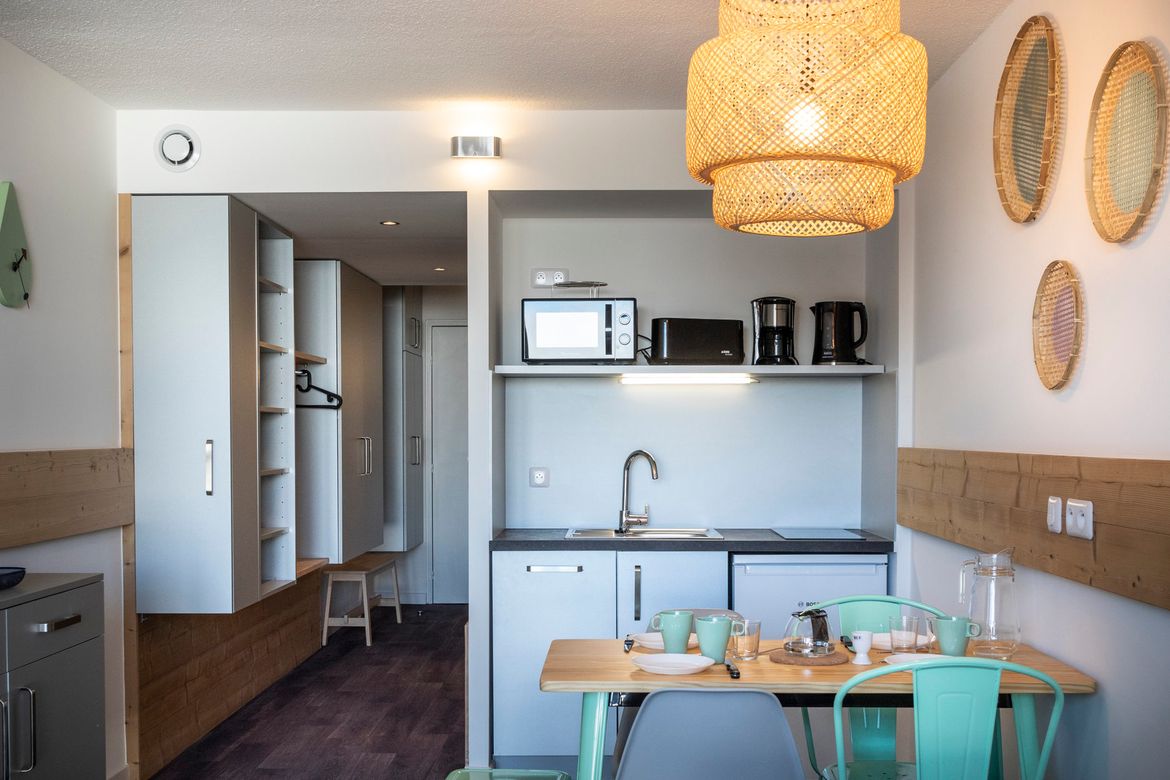 Studio cabine rénové et coloré d'une superficie de 28m² pour 4 personnes, situé au 8ème étage de la résidence Varet 2, balcon exposé Nord/Nord-Ouest avec vue côté Mont Blanc Entrée comportant un coin cabine avec 2 lits superposés en 80c cm (le couchage en hauteur ne convient pas aux enfants de - 6a...