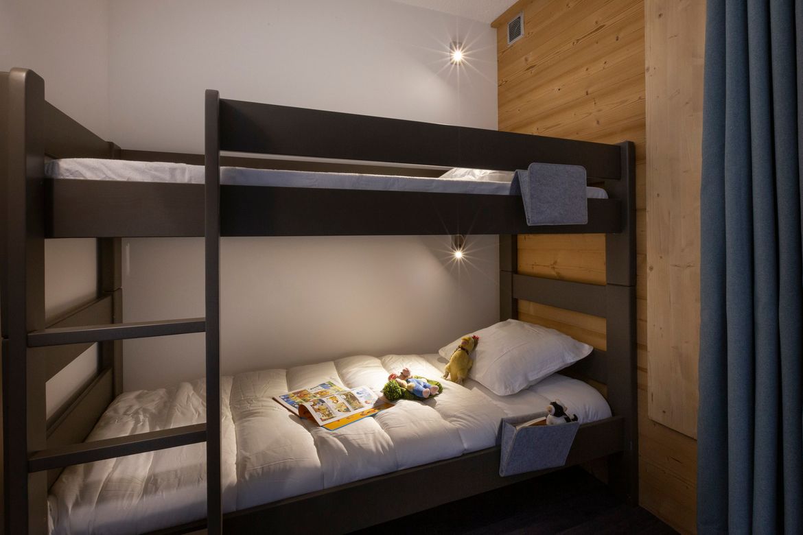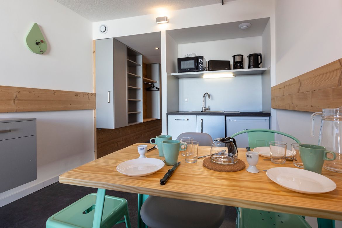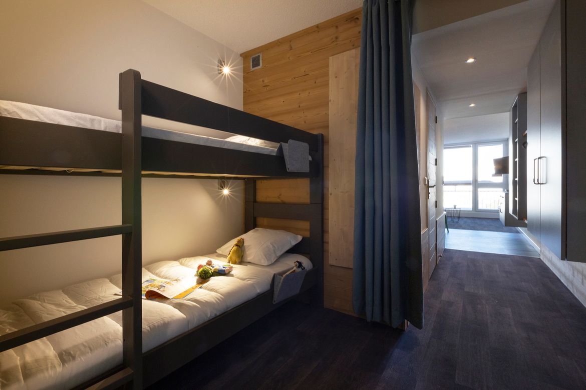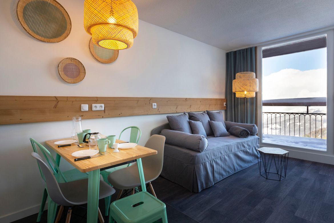Studio cabine rénové et coloré d'une superficie de 28m² pour 4 personnes, situé au 8ème étage de la résidence Varet 2, balcon exposé Nord/Nord-Ouest avec vue côté Mont Blanc Entrée comportant un coin cabine avec 2 lits superposés en 80c cm (le couchage en hauteur ne convient pas aux enfants de - 6a...