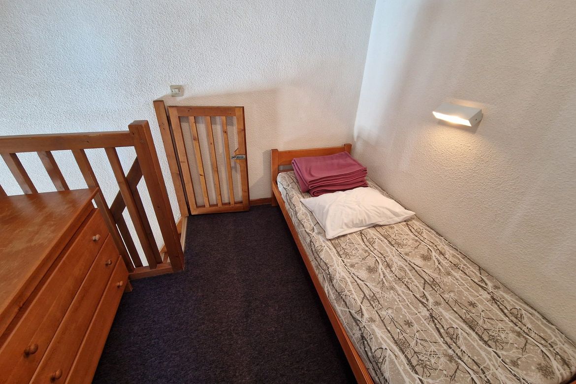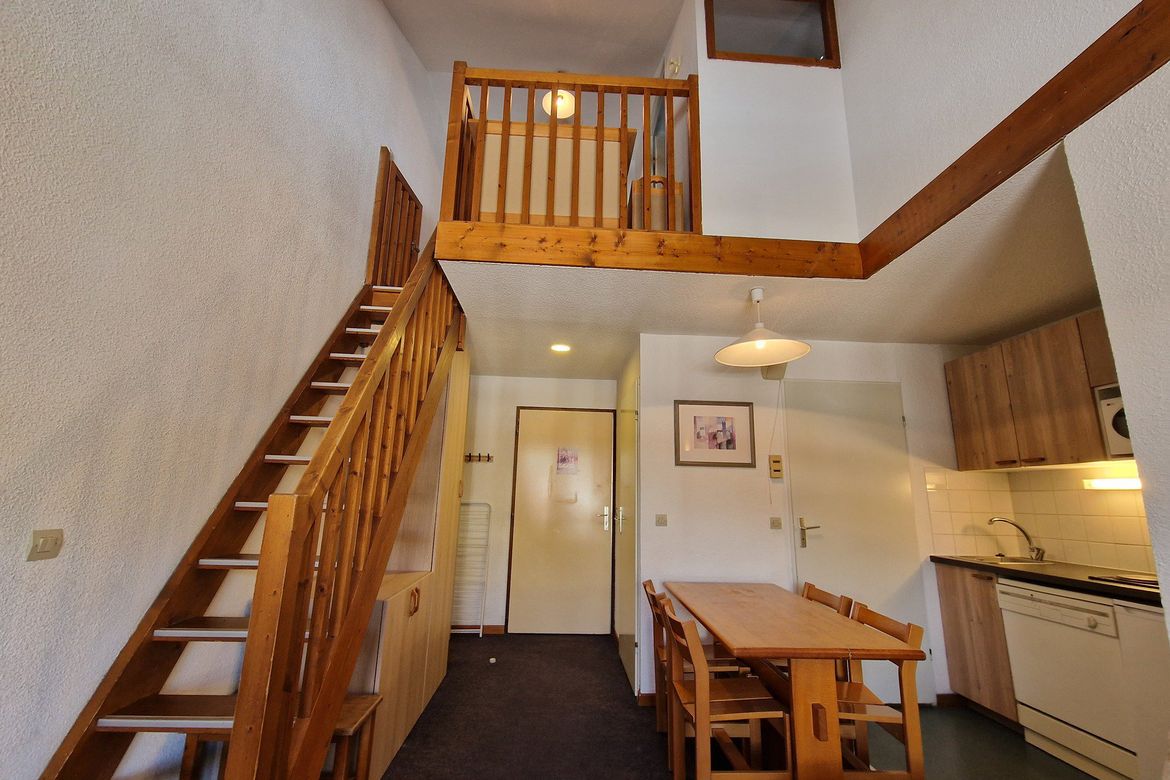 Appartement pour 6 personnes en duplex, classé deux étoiles et deux cristaux Paradiski Cet appartement se trouve au 7ème étage avec ascenseur de la résidence Le Cervins à Plagne Soleil. Il se compose au 1er étage d'une cuisine ouverte sur le séjour, d'un WC et avec accès au balcon. L'étage dessert...