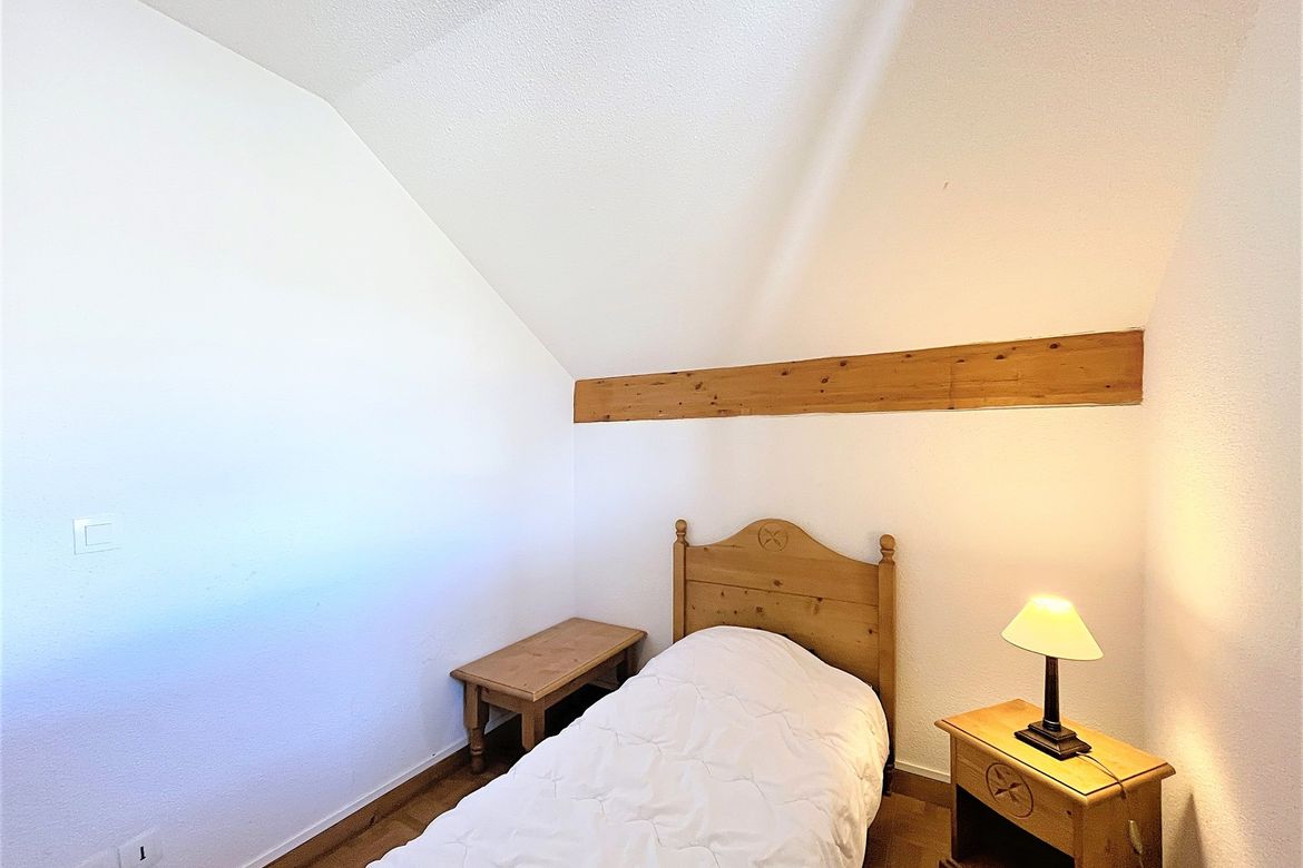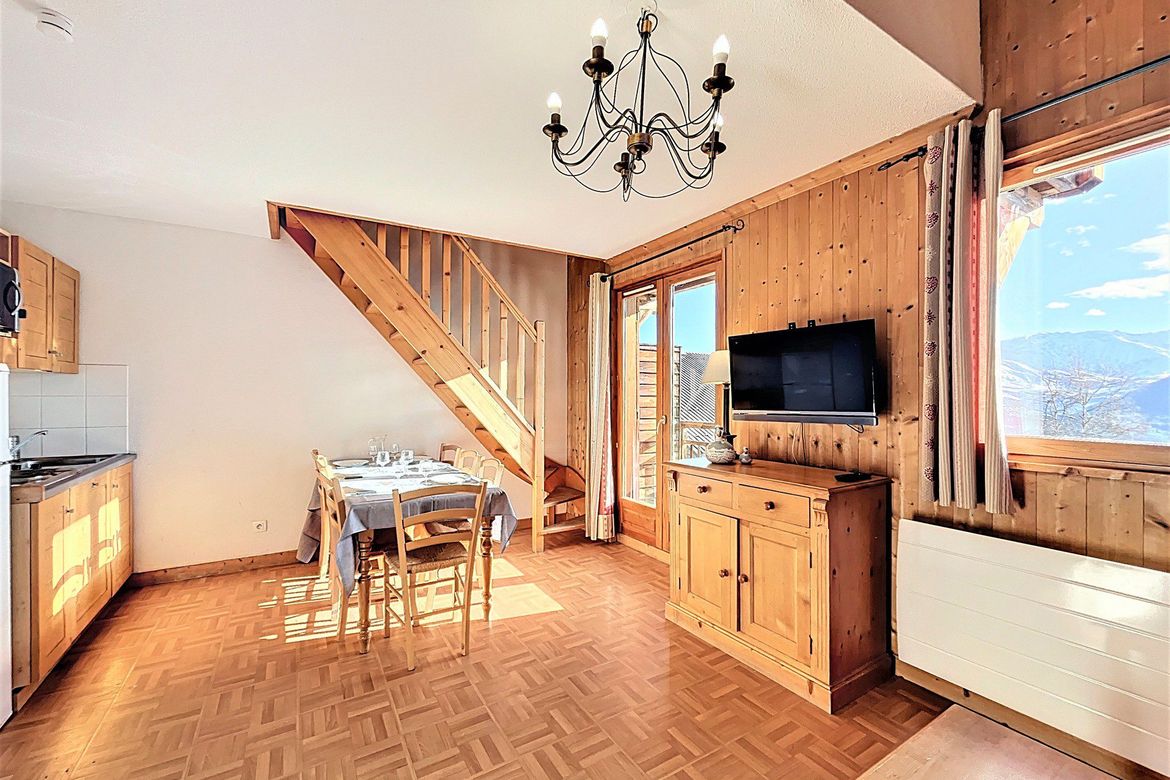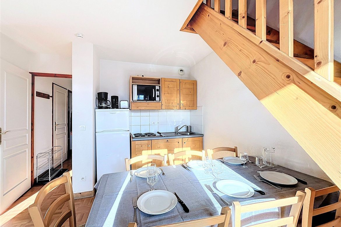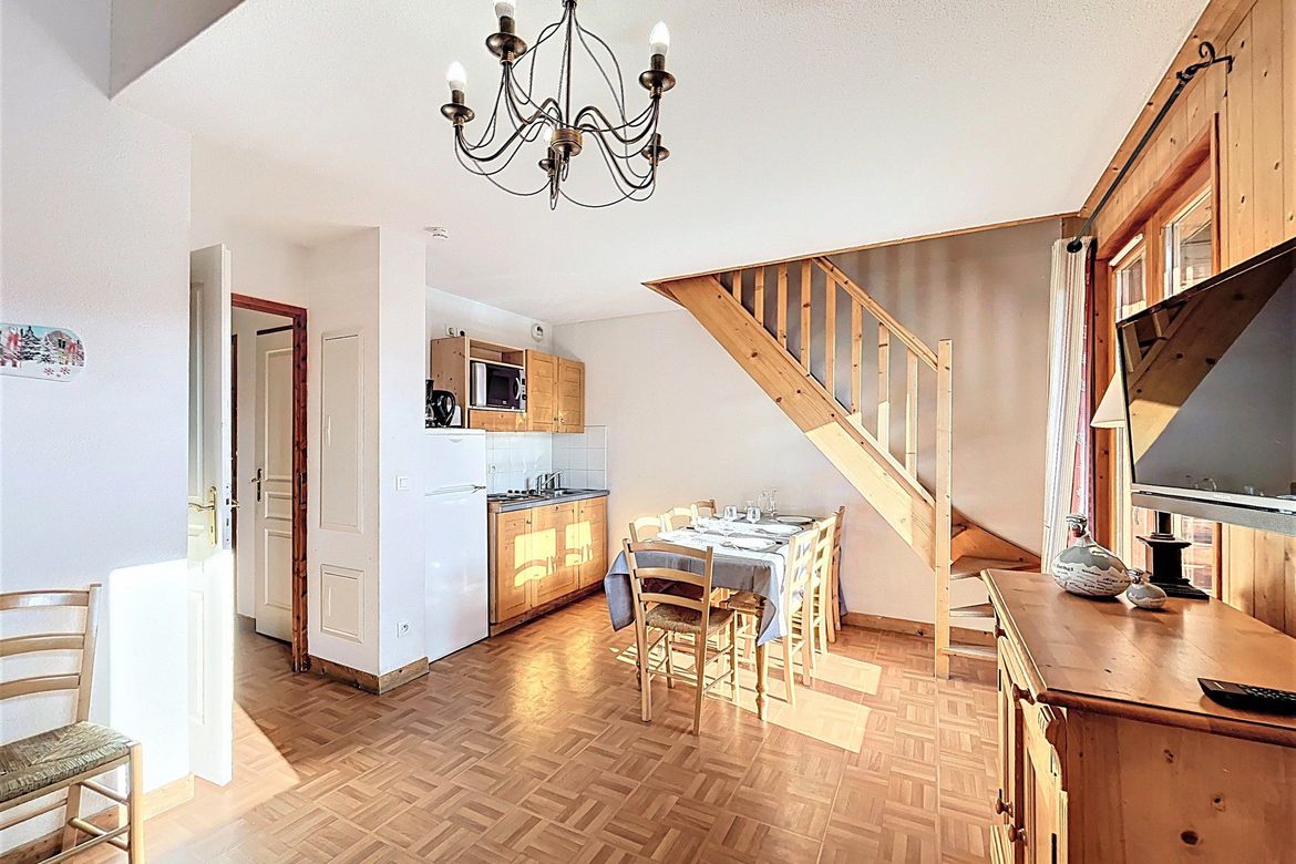 Appartement spacieux en duplex pour 7/8 personnes, de 55 m² avec balcon exposé sud donnant sur une magnifique vue montagnes. Logement fonctionnel, comprenant, un séjour équipé d'une banquette lit 1 place en couchage d'appoint,, 1 TV écran plat, 1 balcon plein sud. Un coin cuisine avec 1 plaque él...