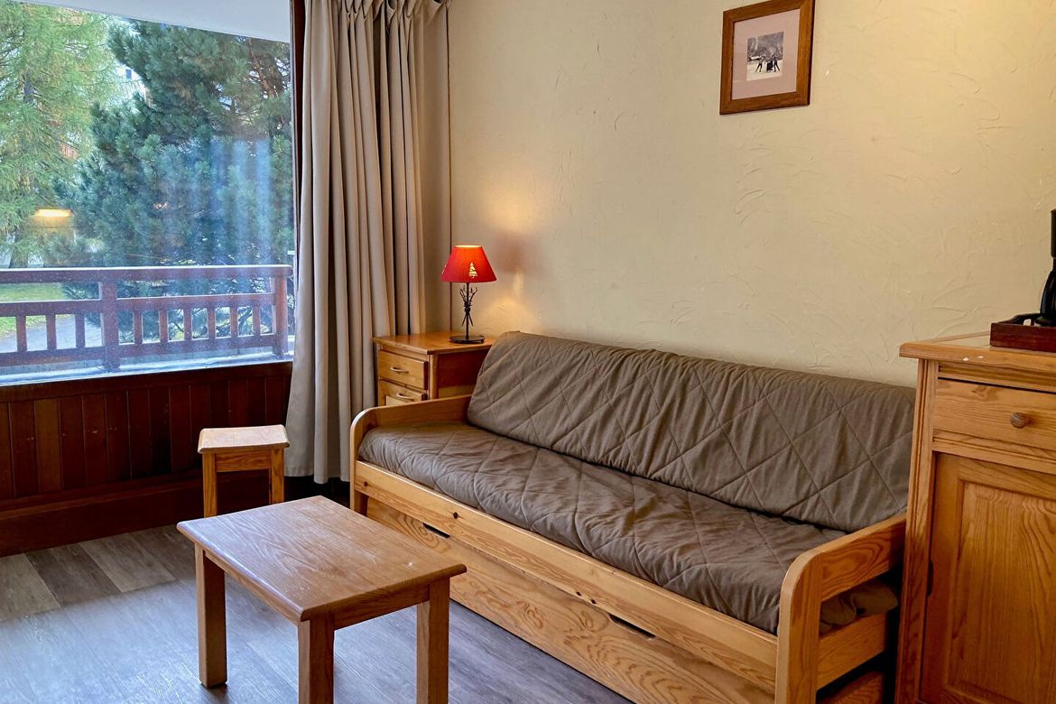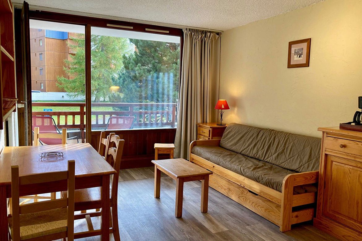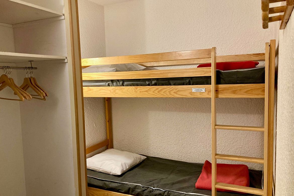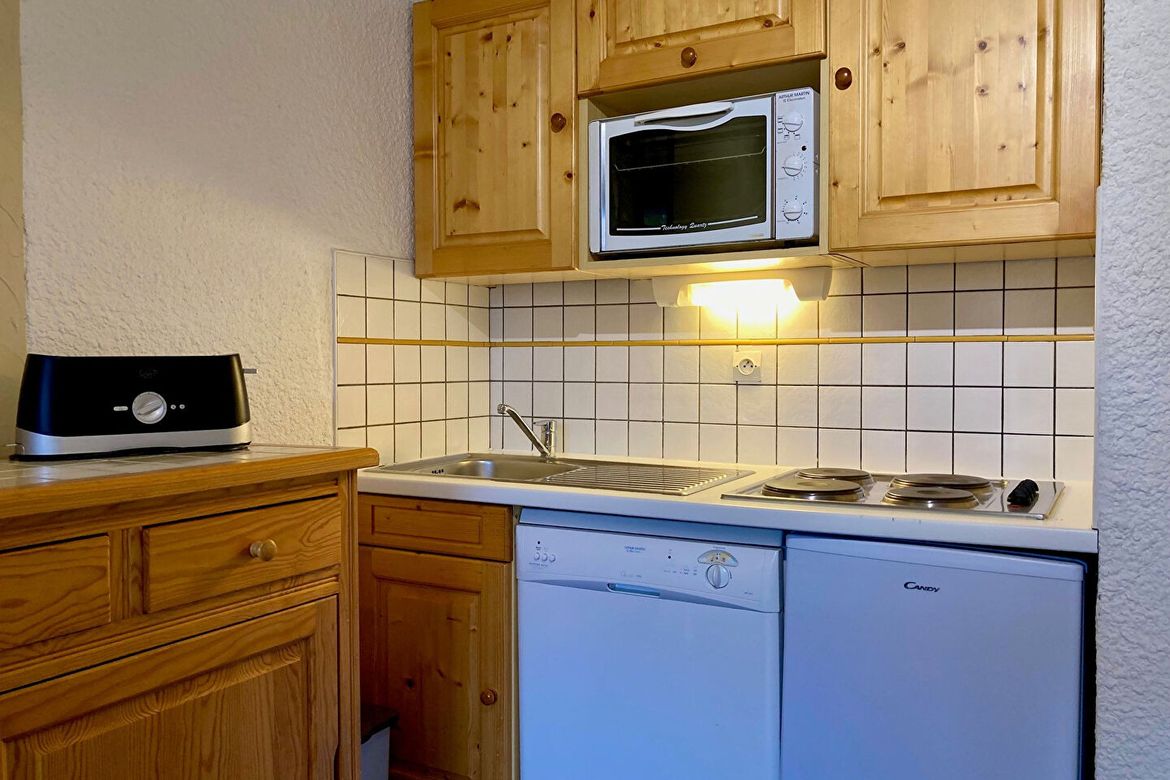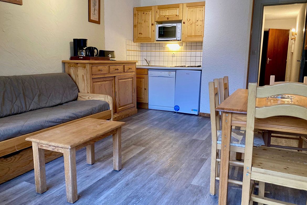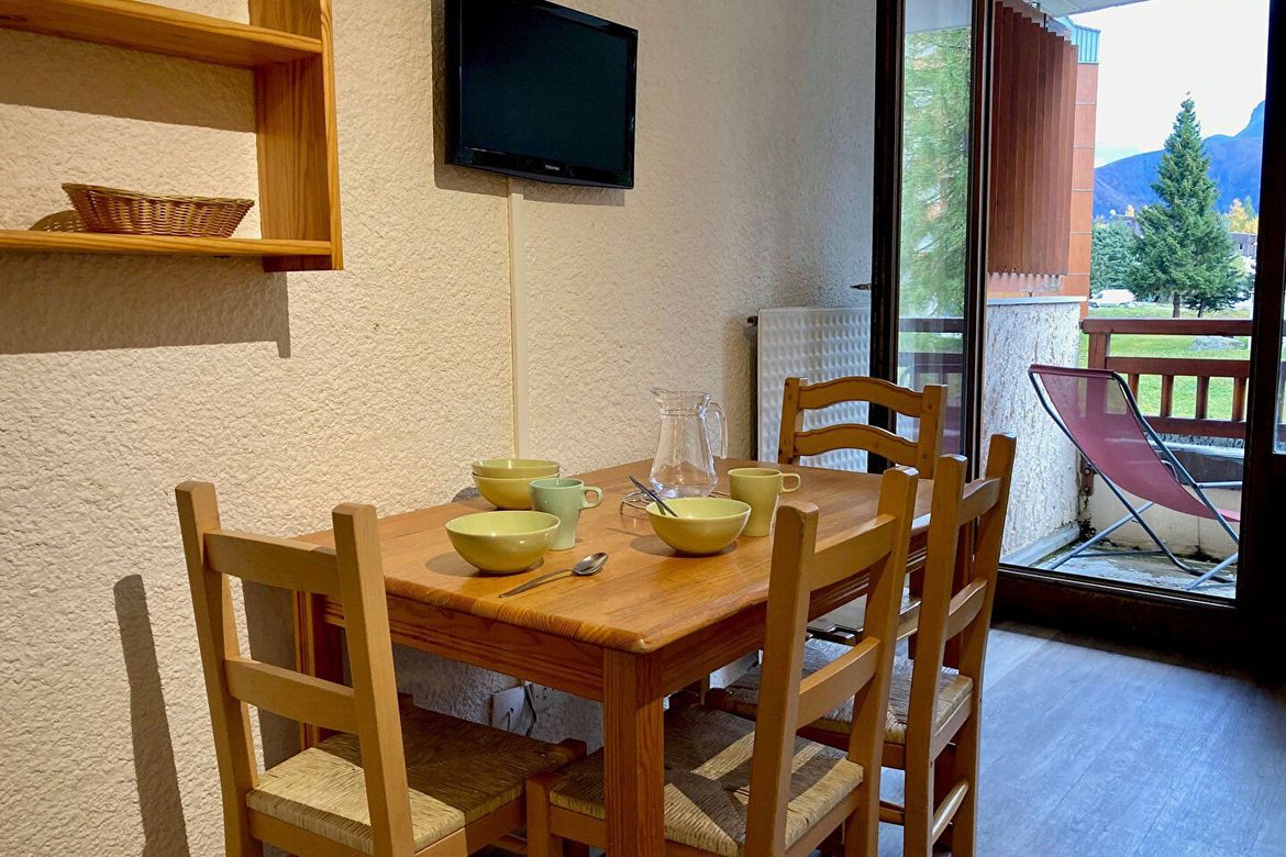 Studio coin montagne pour 4 personnes. Il est situé au 1. étage et possède un balcon Sud. Coin montagne en retrait de l'entrée : 1 lit superposé. Porte de séparation avec le salon. Séjour : 1 banquette lit + 1 lit gigogne relevable. Equipé d'une télévision. Balcon Sud. Cuisine : 4 plaques, réfrigér...