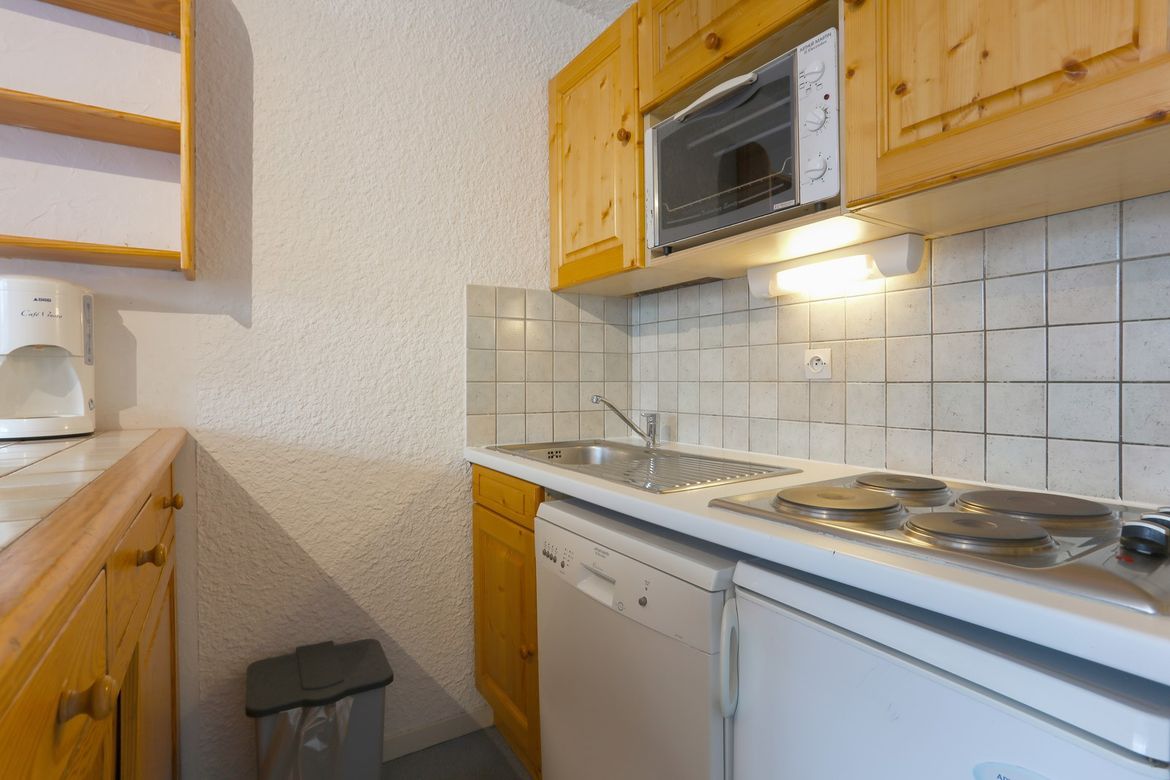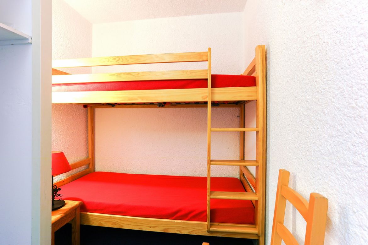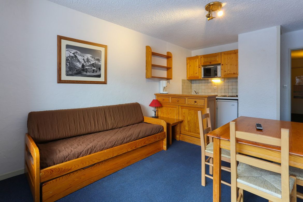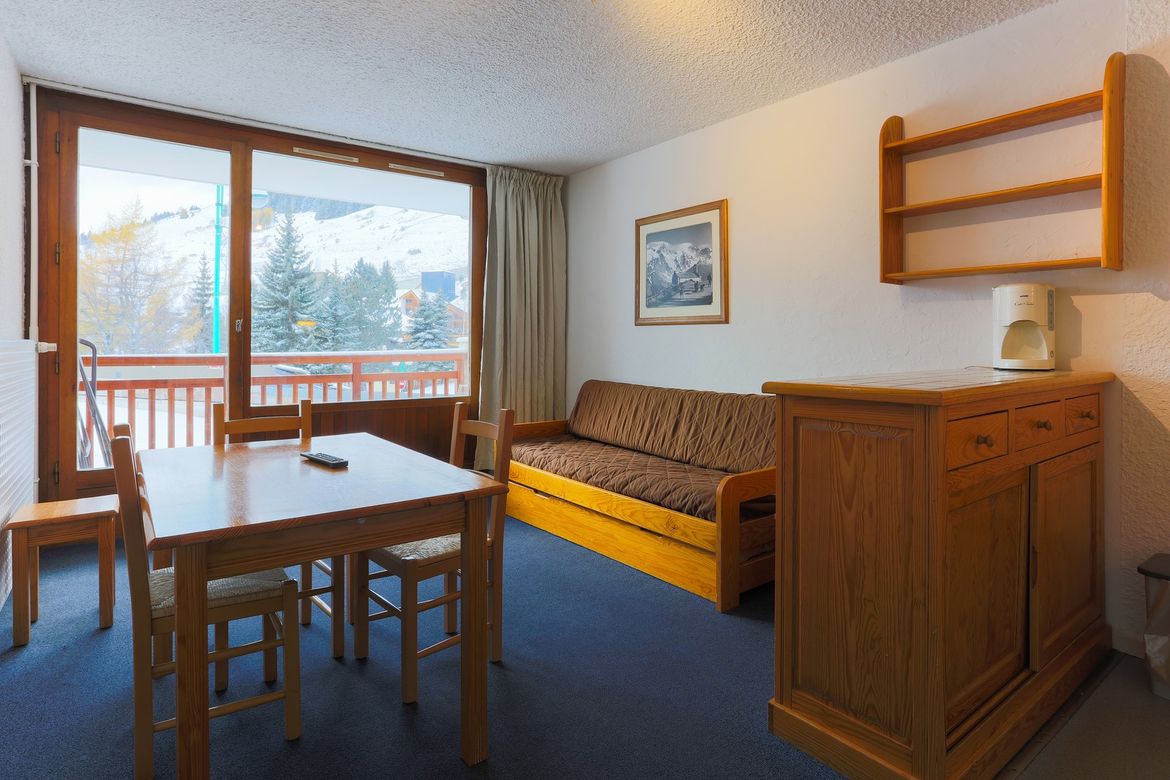 Studio coin montagne pour 4 personnes. Il est situé au 1. étage et possède un balcon Sud-Ouest. Coin montagne en retrait de l'entrée : 1 lit superposé. Porte de séparation avec le salon. Séjour : 1 banquette lit + 1 lit gigogne relevable. Equipé d'une télévision. Balcon Sud-Ouest. Cuisine : 4 plaqu...